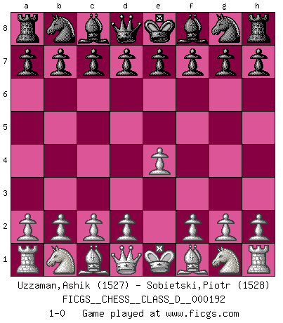Last move : 1-0 2013 April 28 21:26:15 [Event "FICGS__CHESS__CLASS_D__000192"] [Site "FICGS"] [Date "2013.03.19"] [Round "1"] [White "Uzzaman,Ashik"] [Black "Sobietski,Piotr"] [Result "1-0"] [WhiteElo "1527"] [BlackElo "1528"] 1.e4 1-0 This chess game has been lost on time (started : 2013.03.19 12:11:31) King's pawn Opening Player White won this chess game. Follow this game move after move (download)Fischer is completely natural. He plays no roles. He's like a child. Very, very simple. (Zita Rajcsanyi) Korrekt heißt in Deutschland die Haltung eines Mannes, dessen Benehmen nach dem Urteile seiner Nachbarn seiner Stellung angemessen ist. Um korrekt zu sein, muß man sich der Meinung der anderen anpassen... (Emanuel Lasker) Fischer deseaba darle a los Rusos una sopa de su propia medicina. (Larry Evans) A chaque perte on perd un peu de soi. (Joël Lautier) Computers have lots of memory but no imagination. (Anonymous)