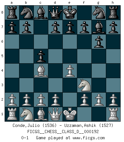 Last move : 0-1 2013 April 19 22:49:0 [Event "FICGS__CHESS__CLASS_D__000192"] [Site "FICGS"] [Date "2013.03.19"] [Round "1"] [White "Conde,Julio"] [Black "Uzzaman,Ashik"] [Result "0-1"] [WhiteElo "1536"] [BlackElo "1527"] 1.e4 c5 2.Nf3 g6 3.Bc4 Bg7 0-1 Sicilian : Hungarian variation Player Black won this chess game. Follow this game move after move (download)Up to this point White has been following well-known analysis. But now he makes a fatal error: he begins to use his own head. (Siegbert Tarrasch) Ein Buch ist ein Spiegel; wenn ein Affe hineinsieht, so kann kein Apostel heraus gucken. (Georg Christoph Lichtenberg) Un Peón pasado aumenta su poder a medida de que el número de piezas en el tablero disminuye. (Capablanca) Comme les marins qui ont mille raisons différentes d'aller en mer, les joueurs d'échecs en ont tout autant avant de s'installer devant une table et jouer... (Vincent Bertignac, philosophe) Wikichess, chess moves explained by 'experimented' players. (Thibault de Vassal)