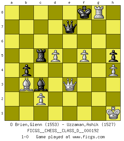 Last move : 1-0 2013 May 22 6:33:36 [Event "FICGS__CHESS__CLASS_D__000192"] [Site "FICGS"] [Date "2013.03.19"] [Round "1"] [White "O Brien,Glenn"] [Black "Uzzaman,Ashik"] [Result "1-0"] [WhiteElo "1553"] [BlackElo "1527"] 1.e4 c5 2.Nf3 g6 3.d4 cxd4 4.Nxd4 Nc6 5.Nc3 Bg7 6.Be3 Nf6 7.Bc4 O-O 8.Bb3 a5 9.f3 d5 10.exd5 Nb4 11.Nde2 Bf5 12.a3 Na6 13.O-O Rc8 14.Ng3 Bd7 15.Bd4 b5 16.Qd3 Nc5 17.Bxc5 Rxc5 18.Nge4 Bf5 19.Rab1 b4 20.axb4 axb4 21.Nxf6+ Bxf6 22.Ne4 Bg7 23.g4 Qb6 24.Qe3 Bxe4 25.fxe4 Qd6 26.Rf3 Be5 27.h4 Kh8 28.Qf2 f6 29.g5 Kg7 30.gxf6+ exf6 31.Kh1 h6 32.Qg2 h5 33.Rg1 f5 34.Rxf5 Rxf5 35.exf5 Bxb2 36.Qd2 Bc3 37.Qe3 Kf8 38.Rxg6 Qe7 39.Rg8+ 1-0 Sicilian : Hungarian variation Kingside Castling by player Black (move 7) Kingside Castling by player White (move 13) Player White won this chess game. Follow this game move after move (download)By playing at Chess then, we may learn: First: Foresight... Second: Circumspection... Third: Caution... And lastly, we learn by Chess the habit of not being discouraged by present bad appearances in the state of our affairs, the habit of hoping for a favorable chance, and that of persevering in the secrets of resources. (Benjamin Franklin) Ich hatte Zahnschmerzen im ersten Spiel. In der zweiten Partie tat mir der Kopf weh. In der dritten war es eine Rheuma-Attacke und während der vierten fühlte ich mich nicht gut. Und in der fünften? Nun, man muss doch nicht jedes Spiel gewinnen, oder? (Savielly Grigorievitsch Tartakower) Me siento como si fuera una pieza en una partida de Ajedrez, cuando mi oponente me indica: esa pieza no puede ser movida. (Soren Kierkegaard) Fischer est le meilleur joueur du monde et Karpov n'est qu'un joueur de bistrot. (Garry Kasparov, agé de 16 ans) A journey of a thousand sites begins with a single click. (Author unknown)