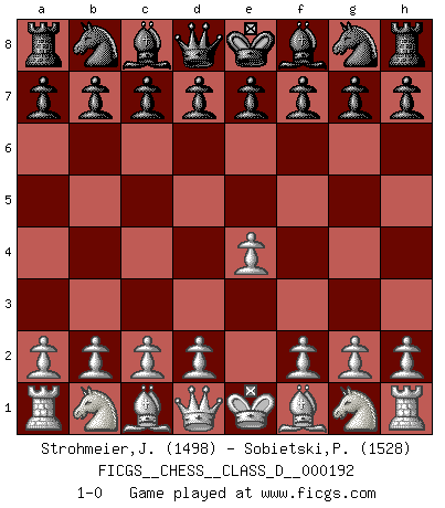 Last move : 1-0 2013 April 28 21:26:15 [Event "FICGS__CHESS__CLASS_D__000192"] [Site "FICGS"] [Date "2013.03.19"] [Round "1"] [White "Strohmeier,Josef"] [Black "Sobietski,Piotr"] [Result "1-0"] [WhiteElo "1498"] [BlackElo "1528"] 1.e4 1-0 This chess game has been lost on time (started : 2013.03.19 12:11:31) King's pawn Opening Player White won this chess game. Follow this game move after move (download)Not all artists are Chess players, but all Chess players are artists. (Marcel Duchamp) Lisa Lane, amerikanische Schachmeisterin, hatte Fischer einmal als stärksten lebenden Spieler bezeichnet. Antwort: Das ist richtig, aber Lisa Lane ist eigentlich nicht in der Lage, das zu beurteilen. (Robert James Fischer) Repentinamente, me resultaba obvio en mi analisis que yo había pasado por alto lo que Fischer había visto en el tablero con la mas grande facilidad. (Mikhail Botvinnik) Aidez vos pièces, elles vous aideront. (Paul Morphy) There are two kinds of people in the world, my friend. Those who have a loaded gun and those who dig. You dig ! (Blondie in The Good, The Bad and The Ugly)