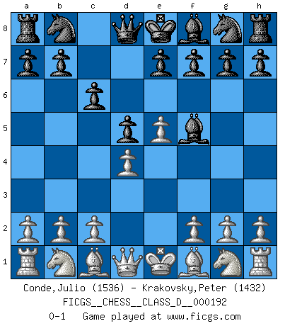 Last move : 0-1 2013 April 17 22:29:2 [Event "FICGS__CHESS__CLASS_D__000192"] [Site "FICGS"] [Date "2013.03.19"] [Round "1"] [White "Conde,Julio"] [Black "Krakovsky,Peter"] [Result "0-1"] [WhiteElo "1536"] [BlackElo "1432"] 1.e4 c6 2.d4 d5 3.e5 Bf5 0-1 Caro-Kann : Advance variation Player Black won this chess game. Follow this game move after move (download)Some part of a mistake is always correct. (Savielly Tartakover) Die Auseinandersetzung mit Karpow war politisch geprägt. Er stand für das kommunistische System, wurde von dessen Repräsentanten gehätschelt. Ich war der Oppositionelle. Jeder Schachweltmeister spiegelt auch die gesellschaftlichen Verhältnisse wider. Kramnik steht für die Börsen-Generation des Neuen Markts, ideologiefrei, zahlenfixiert. (Garry Kasparov) El Ajedrez es parte de la cultura, y si una cultura esta en decadencia, entonces también el Ajedrez declinará. (Mikhail Botvinnik) Un journaliste : 'Vous préférez avoir une dame de plus sur l'échiquier ou au lit ?' Boris Spassky : 'Ca dépend de la position.' Inventor: A person who makes an ingenious arrangement of wheels, levers and springs, and believes it civilization. (Ambrose Bierce, The Devil's Dictionary)