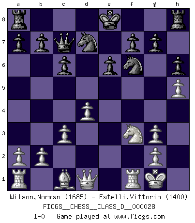 Last move : 1-0 2007 May 5 13:55:25 [Event "FICGS__CHESS__CLASS_D__000028"] [Site "FICGS"] [Date "2007.01.27"] [Round "1"] [White "Wilson,Norman"] [Black "Fatelli,Vittorio"] [Result "1-0"] [WhiteElo "1685"] [BlackElo "1400"] 1.e4 c6 2.d4 d5 3.Nc3 dxe4 4.Nxe4 Bf5 5.Ng3 Bg6 6.h4 h6 7.h5 Bh7 8.Nf3 Nd7 9.Bd3 Bxd3 10.Qxd3 Ngf6 11.Qb3 Qc7 12.c3 e6 13.O-O Bd6 14.Qd1 Bxg3 15.fxg3 1-0 This chess game has been lost on time (started : 2007.01.27 6:20:21) Caro-Kann : Classical, 6.h4 Kingside Castling by player White (move 13) Player White won this chess game. Follow this game move after move (download)The sign of a great Master is his ability to win a won game quickly and painlessly. (Irving Chernev) Über Karpov: Er war und ist ein Vertreter der russischen Reaktionäre. Das steckt tief in seiner Seele, wehalb ich nicht nett mit ihm umgehen kann. (Viktor Kortschnoi) Hoy en día, si tu no eres un Gran Maestro a los 14 años, es mejor que lo olvides. (Anand Viswanathan) Il n'y a pas de prix trop élevé au scalp de l'ennemi. (Koblentz) We're missing something. (Gregory House, House M.D.)