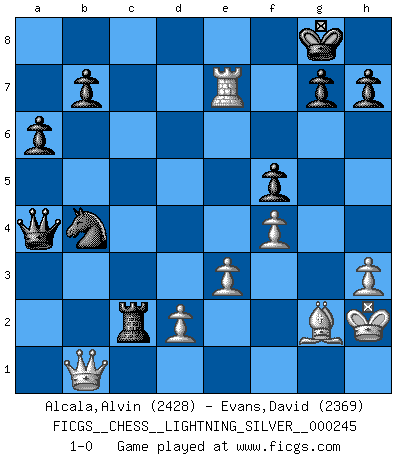 Last move : 1-0 2013 March 19 17:14:29 [Event "FICGS__CHESS__LIGHTNING_SILVER__000245"] [Site "FICGS"] [Date "2013.03.19"] [Round "1"] [White "Alcala,Alvin"] [Black "Evans,David"] [Result "1-0"] [WhiteElo "2428"] [BlackElo "2369"] 1.c4 e5 2.Nc3 Nf6 3.g3 d5 4.cxd5 Nxd5 5.Bg2 Nb6 6.e3 c5 7.Nge2 Nc6 8.O-O Bd6 9.b3 O-O 10.f4 Bg4 11.h3 Bxe2 12.Qxe2 exf4 13.gxf4 Be7 14.Bb2 Rc8 15.Rfd1 f5 16.Rac1 a6 17.Kh2 Qd7 18.Na4 Nxa4 19.bxa4 Qe6 20.Ba3 Qxa2 21.Bxc5 Bxc5 22.Rxc5 Nb4 23.Ra1 Qe6 24.Rac1 Rxc5 25.Rxc5 Rc8 26.Re5 Qd7 27.Qd1 Rc2 28.Qb1 Qxa4 29.Re7 1-0 English : Bremen, reverse Dragon Kingside Castling by player White (move 8) Kingside Castling by player Black (move 9) Player White won this chess game. Follow this game move after move (download)Chess is a terrible game. If you have no center, your opponent has a freer position. If you do have a center, then you really have something to worry about ! (Siegbert Tarrasch) Ein Remis kann durch Wiederholung von drei Zügen oder durch einen schlechte Zug erreicht werden. (Savielly Grigorievitsch Tartakower) Aquel que toma al Peón de Caballo de la Reina, se pasará la noche a dormir en la calle. (Anónimo) Il vaut mieux sacrifier les pièces de l'adversaire. (Xavier Tartacover) Always remember that you are unique; just like everyone else. (Unknown)