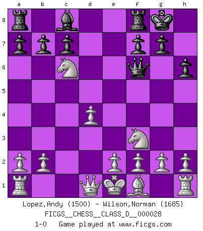Last move : 1-0 2007 March 8 8:41:18 [Event "FICGS__CHESS__CLASS_D__000028"] [Site "FICGS"] [Date "2007.01.27"] [Round "1"] [White "Lopez,Andy"] [Black "Wilson,Norman"] [Result "1-0"] [WhiteElo "1500"] [BlackElo "1685"] 1.Nf3 d5 2.d4 Nf6 3.c4 e6 4.Bg5 h6 5.Bxf6 Qxf6 6.Nc3 Nc6 7.cxd5 exd5 8.Nxd5 Bb4+ 9.Nxb4 O-O 10.Nxc6 1-0 Reti Opening Kingside Castling by player Black (move 9) Player White won this chess game. Follow this game move after move (download)Life is a kind of Chess, with struggle, competition, good and ill events. (Benjamin Franklin) Ein bischen Romantik kann weder im Schach noch in der Liebe schaden. Also versuche ich mich ab und zu daran zu erinnern. (Nigel Short) El Ajedrez era la lengua materna de Capablanca. (Reti) Le génie consiste à savoir transgresser les règles au moment opportun. (Teichmann) Gambling : The sure way of getting nothing from something. (Wilson Mizner)