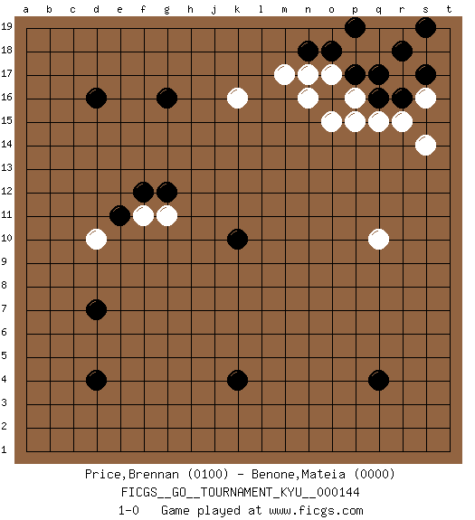 Last move : 1-0 2013 June 18 1:16:42 [Event "FICGS__GO__TOURNAMENT_KYU__000144"] [Site "FICGS"] [Date "2013.03.20"] [Round "1"] [Black "Price,Brennan"] [White "Benone,Mateia"] [Result "1-0"] [Rating 1 "0100"] [Rating 2 "0000"] 1.r16 q15 2.q16 p16 3.p17 o17 4.d4 r15 5.d16 q10 6.q4 p18 7.q17 q18 8.o16 p15 9.o18 n17 10.n18 m17 11.r18 r19 12.p19 q19 13.s19 s16 14.s17 s14 15.k4 d10 16.k10 k16 17.g16 o15 18.d7 n16 19.e11 f11 20.f12 g11 21.g12 1-0 This go game has been lost on time (started : 2013.03.20 1:15:11) Here are the names of the openings (joseki) played in the four corners : Corner q16 : r16 q15 Komoku (Somok, Xiao~mu`) 3-4 Point. The komoku (3-4) point is the traditional corner enclosure move.. Player Black won this Go (weiqi, baduk) game. Follow this game move after move (download)When your opponent has two weak groups, attack them both at once. (Anonymous) Luck is the residue of design. (John Milton)