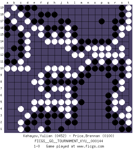 Last move : 1-0 2013 July 24 19:31:51 [Event "FICGS__GO__TOURNAMENT_KYU__000144"] [Site "FICGS"] [Date "2013.03.20"] [Round "1"] [Black "Kehayov,Yulian"] [White "Price,Brennan"] [Result "1-0"] [Rating 1 "0452"] [Rating 2 "0100"] 1.r16 c4 2.q3 d17 3.p17 d10 4.q9 k4 5.k17 k10 6.e3 d3 7.e2 e4 8.d2 c2 9.f4 e5 10.h4 j5 11.c15 c16 12.c13 d15 13.c14 g5 14.j3 g4 15.g3 f5 16.f3 k3 17.k2 h2 18.h3 j2 19.l2 h5 20.j1 c10 21.b16 b17 22.a15 d14 23.g16 g14 24.g2 d13 25.c12 d12 26.b11 b10 27.a12 a10 28.a11 c11 29.b13 k15 30.l13 k13 31.k8 l9 32.l8 m10 33.l15 l14 34.m14 k14 35.m13 l12 36.l16 k16 37.j16 r5 38.r7 s3 39.r3 r4 40.s2 t4 41.o11 q13 42.r12 q12 43.q11 o12 44.n12 o13 45.p14 n13 46.n14 p11 47.p10 p13 48.o14 r11 49.q10 s12 50.r13 n11 51.o10 m12 52.n9 r14 53.q14 s13 54.r15 s15 55.j9 h10 56.h8 h9 57.g8 e8 58.m8 f9 59.l6 l5 60.m5 k6 61.l7 j7 62.j8 j10 63.l4 k5 64.l3 r6 65.q6 s7 66.r8 s8 67.s9 s5 68.q5 t9 69.s10 t10 70.s11 t11 71.r10 r12 72.q4 f7 73.g9 g10 74.g7 g6 75.j15 j14 76.f17 f15 77.g15 f16 78.e17 e16 79.d18 c18 80.d19 g17 81.g18 h17 82.h18 e18 83.f18 h15 84.j17 h14 85.h16 f1 86.d1 c1 87.a17 h1 88.g1 a18 89.a16 b19 90.e19 t2 91.s1 s16 92.s17 t17 93.s18 t18 94.s19 t16 95.t1 t3 96.r2 h7 97.pass p12 98.m9 k9 99.n10 f8 100.c19 k7 101.r17 t19 102.pass j4 103.pass 1-0 Here are the names of the openings (joseki) played in the four corners : Corner d4 : c4 e3 Komoku (Somok, Xiao~mu`) 3-4 Point. The komoku (3-4) point is the traditional corner enclosure move.. Ikken Kakari (Hankan Keolch'im, Yi Gua`jiao~, 1-Space Low Pincer). The small knight move is the basic approach move to the 3-4 point stone. It has been continually used for over four centuries. There are limitless variations, with new moves constantly being discovered. Black 2 opens the door to a treaure store of joseki. Corner d16 : d17 c15 Komoku (Somok, Xiao~mu`) 3-4 Point. The komoku (3-4) point is the traditional corner enclosure move.. Ikken Kakari (Hankan Keolch'im, Yi Gua`jiao~, 1-Space Low Pincer). The small knight move is the basic approach move to the 3-4 point stone. It has been continually used for over four centuries. There are limitless variations, with new moves constantly being discovered. Black 2 opens the door to a treaure store of joseki. Player Black won this Go (weiqi, baduk) game. Follow this game move after move (download)On the third line, four die, six live. (Anonymous) Computer Science is no more about computers than astronomy is about telescopes. (Edsger W. Dijkstra)