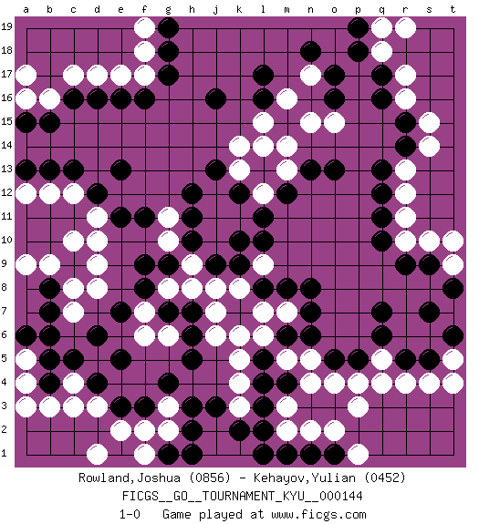 Last move : 1-0 2013 March 28 0:17:28 [Event "FICGS__GO__TOURNAMENT_KYU__000144"] [Site "FICGS"] [Date "2013.03.20"] [Round "1"] [Black "Rowland,Joshua"] [White "Kehayov,Yulian"] [Result "1-0"] [Rating 1 "0856"] [Rating 2 "0452"] 1.q16 d3 2.c16 r4 3.c5 e17 4.g17 c17 5.d16 d17 6.e16 b16 7.b15 a17 8.b13 c4 9.e5 p3 10.q10 r17 11.q17 r16 12.r15 s15 13.r14 q18 14.p18 r19 15.n18 s14 16.q6 n4 17.m6 c7 18.c9 d8 19.b6 d9 20.f8 d10 21.f11 c10 22.b8 b9 23.b7 c8 24.d12 c12 25.c13 b12 26.e11 d11 27.e13 a9 28.b4 b3 29.d4 c3 30.e3 e2 31.f3 f2 32.h3 r13 33.q13 r12 34.q12 k6 35.m4 m3 36.l4 n5 37.n6 k4 38.l3 m2 39.l2 k5 40.l8 m5 41.l5 l6 42.j3 k3 43.k2 k8 44.k9 j8 45.j9 l7 46.m8 h8 47.h6 j6 48.h5 j7 49.g9 m7 50.n7 h9 51.h10 g8 52.f9 l9 53.n8 j10 54.k10 j11 55.l11 g10 56.h11 g11 57.h12 k11 58.l10 k13 59.k12 j12 60.j13 r10 61.r9 s10 62.q11 r11 63.s9 k14 64.s5 s4 65.p5 m14 66.l16 l15 67.j16 m16 68.l17 n15 69.l13 l14 70.n13 n17 71.o16 o15 72.o17 m13 73.m12 l12 74.o13 f7 75.g7 g6 76.h7 f6 77.e7 p4 78.o5 o4 79.r5 f18 80.g18 f17 81.f16 a4 82.b5 g2 83.h2 g3 84.g4 a5 85.a6 a3 86.a13 a12 87.d6 q4 88.m1 o2 89.o1 p1 90.h1 d1 91.g1 f1 92.n1 n2 93.l1 t5 94.s7 q5 95.q7 t9 96.t8 t10 97.t6 t4 98.p19 q19 99.g19 f19 100.a15 a16 101.pass 1-0 Here are the names of the openings (joseki) played in the four corners : Corner d4 : d3 c5 Komoku (Somok, Xiao~mu`) 3-4 Point. The komoku (3-4) point is the traditional corner enclosure move.. Ikken Kakari (Hankan Keolch'im, Yi Gua`jiao~, 1-Space Low Pincer). The small knight move is the basic approach move to the 3-4 point stone. It has been continually used for over four centuries. There are limitless variations, with new moves constantly being discovered. Black 2 opens the door to a treaure store of joseki. Corner d16 : c16 e17 Komoku (Somok, Xiao~mu`) 3-4 Point. The komoku (3-4) point is the traditional corner enclosure move.. Ikken Kakari (Hankan Keolch'im, Yi Gua`jiao~, 1-Space Low Pincer). The small knight move is the basic approach move to the 3-4 point stone. It has been continually used for over four centuries. There are limitless variations, with new moves constantly being discovered. White 2 opens the door to a treaure store of joseki. Corner q16 : q16 r17 Hoshi (Hwajeom, Seongjeom, Xingwei`) 4-4 Point. The star or hoshi (4-4) point, emphasizing influence at the potential expense of territory. Player Black won this Go (weiqi, baduk) game. Follow this game move after move (download)Empty triangles are bad. (Anonymous) All the biggest technological inventions created by man - the airplane, the automobile, the computer - says little about his intelligence, but speaks volumes about his laziness. (Mark Kennedy)