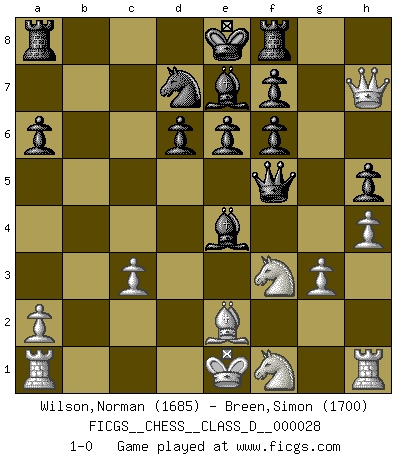 Last move : 1-0 2007 June 16 13:52:29 [Event "FICGS__CHESS__CLASS_D__000028"] [Site "FICGS"] [Date "2007.01.27"] [Round "1"] [White "Wilson,Norman"] [Black "Breen,Simon"] [Result "1-0"] [WhiteElo "1685"] [BlackElo "1700"] 1.e4 c5 2.Nf3 d6 3.d4 cxd4 4.Nxd4 Nf6 5.Nc3 a6 6.Bg5 e6 7.f4 Be7 8.Qf3 b5 9.Bxf6 gxf6 10.Qg3 b4 11.Qg7 Rf8 12.Nce2 h5 13.h4 Bb7 14.Ng3 Qb6 15.Nf3 Qe3+ 16.Be2 Bxe4 17.Nf1 Qxf4 18.c3 bxc3 19.bxc3 Nd7 20.g3 Qf5 21.Qh7 1-0 This chess game has been lost on time (started : 2007.01.27 6:20:21) Sicilian : Najdorf, 7...Be7 Player White won this chess game. Follow this game move after move (download)Up to this point White has been following well-known analysis. But now he makes a fatal error: he begins to use his own head. (Siegbert Tarrasch) Es gibt Leute, die glauben, alles wäre vernünftig, was man mit einem ernsthaften Gesicht tut. (Georg Christoph Lichtenberg) Si un gobernante no entiende al Ajedrez, ¿como puede governar él un reinado?. (El Rey Khusros II) Les Cavaliers se révèlent fort utiles dans les positions fermées. D'habitude, les Fous sont un peu plus forts que les Cavaliers dans les positions ouvertes. Qu'on le veuille ou non, il restera toujours des exceptions ! No, no, you're not thinking; you're just being logical. (Niels Bohr)