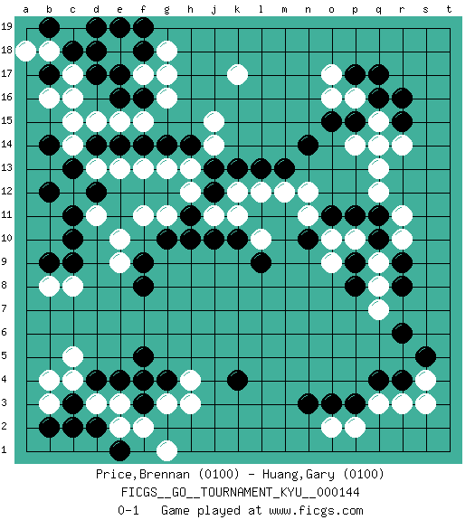 Last move : 0-1 2013 September 9 3:0:11 [Event "FICGS__GO__TOURNAMENT_KYU__000144"] [Site "FICGS"] [Date "2013.03.20"] [Round "1"] [Black "Price,Brennan"] [White "Huang,Gary"] [Result "0-1"] [Rating 1 "0100"] [Rating 2 "0100"] 1.r16 d15 2.q4 c5 3.k4 p16 4.p17 o17 5.q17 o16 6.q10 k17 7.d4 c4 8.c3 d3 9.e4 e3 10.f3 f2 11.d2 e2 12.f5 g3 13.g4 h4 14.f4 h3 15.d17 c17 16.c18 c16 17.e16 e18 18.d18 g18 19.e17 f17 20.b2 b3 21.c2 b4 22.e1 g1 23.c10 c8 24.c13 d13 25.d12 f15 26.d14 c14 27.e14 e15 28.b14 c15 29.b12 e13 30.f14 f13 31.g14 g13 32.h14 h13 33.f16 g16 34.b17 b16 35.f19 b18 36.f18 g17 37.b19 a18 38.e19 c19 39.d19 j14 40.k10 q12 41.q14 p14 42.p15 q15 43.o15 r14 44.r15 q13 45.q16 q14 46.n14 n12 47.m13 m12 48.l13 l12 49.k13 k12 50.j13 j15 51.j12 j11 52.h11 h12 53.j10 k11 54.g10 g11 55.h10 f11 56.f8 e9 57.f9 e10 58.c9 d11 59.c11 b8 60.b9 l10 61.l9 r3 62.r4 q3 63.p3 p2 64.o3 o2 65.n3 s4 66.s5 s3 67.r6 r10 68.r9 r11 69.q11 q9 70.p9 q8 71.r8 p10 72.p11 o10 73.p8 q7 74.o11 n11 75.n10 o9 0-1 Here are the names of the openings (joseki) played in the four corners : Corner q16 : r16 p16 Komoku (Somok, Xiao~mu`) 3-4 Point. The komoku (3-4) point is the traditional corner enclosure move.. Ikken Takagakari (Hankan Nop'dakeolch'im, Yi Gaogua`jiao~, 1-Space High Approach). The 5-4 approach move has become more popular in modern times, as modern Go emphasizes speed and influence. Corner d4 : c5 d4 Mokuhazushi (Waemok, Wai`mu`) 5-3 Point. The mokuhazushi (5-3) point was popular in the Edo period in Japan (1600 - 1867). It emphasizes influence; territorially, it is inferior to the 3-4 point. Corner d16 : d15 d17 Takamoku (Gomok, Gaomu`) 5-4 Point. The takamoku (high) point (5-4). With its emphasis on influence, the 5-4 point complements the 4-4 (hoshi) point in creating an influence-oriented fuseki. Komoku. White responds with 3-3, 3-5, 4-6, 4-7, 3-6, 3-7. Player White won this Go (weiqi, baduk) game. Follow this game move after move (download)Don't make dango's. (Anonymous) When a man with money meets a man with experience, the man with experience leaves with money and the man with money leaves with experience. (Anonymous)