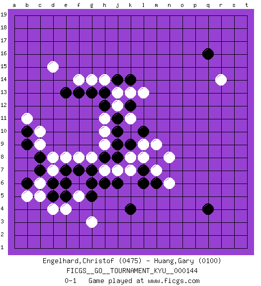 Last move : 0-1 2013 July 24 16:36:24 [Event "FICGS__GO__TOURNAMENT_KYU__000144"] [Site "FICGS"] [Date "2013.03.20"] [Round "1"] [Black "Engelhard,Christof"] [White "Huang,Gary"] [Result "0-1"] [Rating 1 "0475"] [Rating 2 "0100"] 1.q16 d15 2.q4 e4 3.d5 d4 4.k4 c5 5.d6 c6 6.c7 d7 7.e7 d8 8.e5 f5 9.e6 e8 10.f7 g8 11.g7 h7 12.g6 f8 13.h6 g3 14.j6 r14 15.c8 c9 16.b9 c10 17.b10 b11 18.b6 b5 19.h8 j7 20.j8 k7 21.l7 k8 22.k9 l8 23.m8 l9 24.j10 m7 25.l6 n8 26.m6 m9 27.l10 n6 28.g5 h10 29.j11 h9 30.j9 h11 31.h12 j12 32.k12 j13 33.h13 h14 34.j14 k13 35.k14 l13 36.g13 g14 37.f13 f14 38.e13 k11 0-1 Here are the names of the openings (joseki) played in the four corners : Corner d4 : e4 d5 Takamoku (Gomok, Gaomu`) 5-4 Point. The takamoku (high) point (5-4). With its emphasis on influence, the 5-4 point complements the 4-4 (hoshi) point in creating an influence-oriented fuseki. Corner q16 : q16 r14 Hoshi (Hwajeom, Seongjeom, Xingwei`) 4-4 Point. The star or hoshi (4-4) point, emphasizing influence at the potential expense of territory. Ikken Kakari (Hankan Keolch'im, Yi Gua`jiao~, 1-Space Low Approach). White 2 is the standard approach move to the 4-4. Player White won this Go (weiqi, baduk) game. Follow this game move after move (download)The possibility or impossibility of an event results logically from the rules. (Pierre Audouard) He who is a good ruler must first have been ruled. (Aristotle)