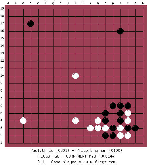 Last move : 0-1 2013 May 16 22:45:29 [Event "FICGS__GO__TOURNAMENT_KYU__000144"] [Site "FICGS"] [Date "2013.03.20"] [Round "1"] [Black "Paul,Chris"] [White "Price,Brennan"] [Result "0-1"] [Rating 1 "0801"] [Rating 2 "0100"] 1.q16 c4 2.d17 q3 3.q5 r5 4.r6 r4 5.q6 k4 6.p3 p4 7.q4 o3 8.p2 k10 9.o4 p5 10.r3 n4 11.o5 q2 12.p6 r2 13.s3 m3 14.o2 n3 0-1 This go game has been lost on time (started : 2013.03.20 1:15:11) Here are the names of the openings (joseki) played in the four corners : Corner q4 : q3 q5 Komoku (Somok, Xiao~mu`) 3-4 Point. The komoku (3-4) point is the traditional corner enclosure move.. Ikken Takagakari (Hankan Nop'dakeolch'im, Yi Gaogua`jiao~, 1-Space High Approach). The 5-4 approach move has become more popular in modern times, as modern Go emphasizes speed and influence. Player White won this Go (weiqi, baduk) game. Follow this game move after move (download)Use a wall to attack, not to make territory. (Anonymous) It's not a bug - it's an undocumented feature. (Anonymous)
