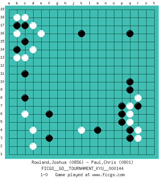 Last move : 1-0 2013 June 2 12:12:9 [Event "FICGS__GO__TOURNAMENT_KYU__000144"] [Site "FICGS"] [Date "2013.03.20"] [Round "1"] [Black "Rowland,Joshua"] [White "Paul,Chris"] [Result "1-0"] [Rating 1 "0856"] [Rating 2 "0801"] 1.q16 d4 2.q3 d17 3.f3 c6 4.c15 e16 5.c11 c13 6.c17 c18 7.b17 d14 8.b14 b13 9.c8 b18 10.q10 b16 11.k16 d2 12.f6 k4 13.m4 q5 14.r7 r3 15.q4 r4 16.p5 q6 17.p6 q7 18.p7 r8 19.q9 1-0 This go game has been lost on time (started : 2013.03.20 1:15:11) Here are the names of the openings (joseki) played in the four corners : Corner d4 : d4 f3 Hoshi (Hwajeom, Seongjeom, Xingwei`) 4-4 Point. The star or hoshi (4-4) point, emphasizing influence at the potential expense of territory. Ikken Kakari (Hankan Keolch'im, Yi Gua`jiao~, 1-Space Low Approach). Black 2 is the standard approach move to the 4-4. Corner d16 : d17 c15 Komoku (Somok, Xiao~mu`) 3-4 Point. The komoku (3-4) point is the traditional corner enclosure move.. Ikken Kakari (Hankan Keolch'im, Yi Gua`jiao~, 1-Space Low Pincer). The small knight move is the basic approach move to the 3-4 point stone. It has been continually used for over four centuries. There are limitless variations, with new moves constantly being discovered. Black 2 opens the door to a treaure store of joseki. Player Black won this Go (weiqi, baduk) game. Follow this game move after move (download)A basic: Don't push too hard. (Jansteen) Strategy without tactics is the slowest route to victory. Tactics without strategy is the noise before defeat. (Sun Tzu)