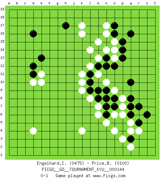 Last move : 0-1 2013 July 19 3:24:46 [Event "FICGS__GO__TOURNAMENT_KYU__000144"] [Site "FICGS"] [Date "2013.03.20"] [Round "1"] [Black "Engelhard,Christof"] [White "Price,Brennan"] [Result "0-1"] [Rating 1 "0475"] [Rating 2 "0100"] 1.d16 q4 2.q16 d4 3.q10 d10 4.p5 k4 5.p4 q5 6.q6 r6 7.q8 p6 8.q7 o6 9.e13 k16 10.h17 k17 11.o5 n5 12.q3 p3 13.r7 o4 14.r5 r4 15.s6 q2 16.d11 e11 17.d12 e10 18.o7 k10 19.p13 n16 20.o17 n17 21.o16 o15 22.p15 o14 23.n15 m15 24.p14 o13 25.o12 n14 26.n13 m13 27.n12 l14 28.m12 l12 29.l11 k11 30.l10 k9 31.l9 l8 32.m8 m7 33.n7 m6 34.n6 p7 35.n9 p8 36.o8 o9 37.n8 n10 38.m9 m11 0-1 Here are the names of the openings (joseki) played in the four corners : Corner q4 : q4 p5 Hoshi (Hwajeom, Seongjeom, Xingwei`) 4-4 Point. The star or hoshi (4-4) point, emphasizing influence at the potential expense of territory. Player White won this Go (weiqi, baduk) game. Follow this game move after move (download)Don't make dango's. (Anonymous) The leaves of memory seemed to make a mournful rustling in the dark. (Henry Wadsworth Longfellow)