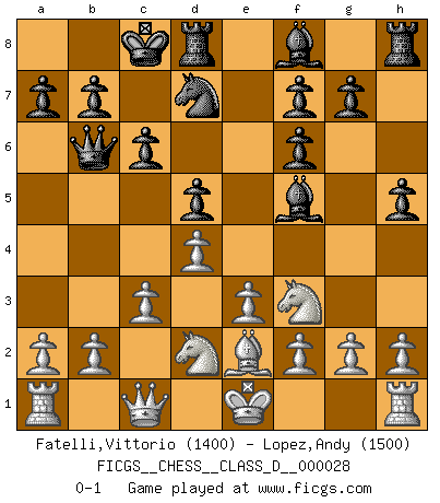 Last move : 0-1 2007 April 10 4:39:33 [Event "FICGS__CHESS__CLASS_D__000028"] [Site "FICGS"] [Date "2007.01.27"] [Round "1"] [White "Fatelli,Vittorio"] [Black "Lopez,Andy"] [Result "0-1"] [WhiteElo "1400"] [BlackElo "1500"] 1.d4 Nf6 2.Bg5 d5 3.Bxf6 exf6 4.Nf3 c6 5.e3 Qb6 6.Qc1 Bf5 7.c3 Nd7 8.Be2 O-O-O 9.Nbd2 h5 0-1 This chess game has been lost on time (started : 2007.01.27 6:20:21) Trompowsky attack (Ruth, Opovcensky Opening) Queenside Castling by player Black (move 8) Player Black won this chess game. Follow this game move after move (download)The hallmark of the artist is simplicity. (Larry Evans) Bis zum Jahr 1971 verlief in meiner Schachkariere alles glatt. Dieses dramatische Match [Fischer-Taimanov 6:0] machte mein Leben zur Hölle. (Mark Taimanov) Hasta este punto, las blancas han seguido un análisis bien conocido. Pero ahora el hace un error fatal: empieza a usar su propia cabeza. (Siegbert Tarrasch) La vérité est comme le meilleur coup aux échecs : elle existe, mais il faut la chercher. (Arturo Perez-Reverte) If you know the enemy and know yourself you need not fear the results of a hundred battles. (Sun Tzu)