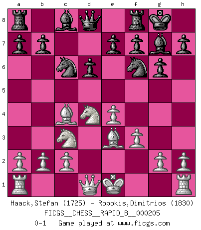 Last move : 0-1 2013 May 10 21:6:6 [Event "FICGS__CHESS__RAPID_B__000205"] [Site "FICGS"] [Date "2013.03.22"] [Round "1"] [White "Haack,Stefan"] [Black "Ropokis,Dimitrios"] [Result "0-1"] [WhiteElo "1725"] [BlackElo "1830"] 1.e4 c5 2.Nf3 g6 3.d4 Bg7 4.Nc3 cxd4 5.Nxd4 Nc6 6.Be3 d6 7.Bc4 Nf6 8.f3 O-O 0-1 Sicilian : Hungarian variation Kingside Castling by player Black (move 8) Player Black won this chess game. Follow this game move after move (download)Alekhine is a poet who creates a work of art out of something that would hardly inspire another man to send home a picture post card. (Max Euwe) Auf jeden Fall musst du zuerst Rechtsanwalt werden, damit du deine eigenen Interessen und die deiner Familie vertreten kannst. [Brief an seinen Sohn] (José Raúl Capablanca) Fischer es una tragedia del Ajedrez Americano a la par con Morphy y Pillsbury. (Mig Greengard) La tactique est l'élément le plus important du milieu de jeu. (Siegbert Tarrasch) No, I am still playing. (Anatoly Karpov)