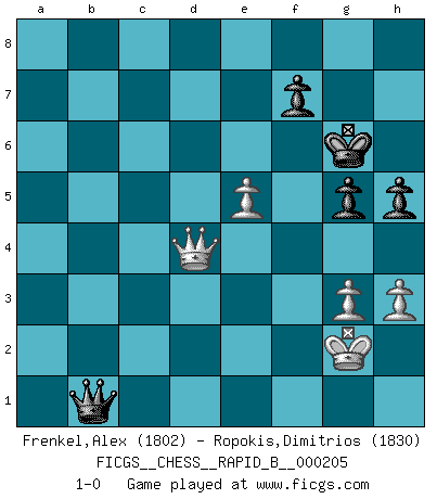 Last move : 1-0 2013 August 5 17:12:30 [Event "FICGS__CHESS__RAPID_B__000205"] [Site "FICGS"] [Date "2013.03.22"] [Round "1"] [White "Frenkel,Alex"] [Black "Ropokis,Dimitrios"] [Result "1-0"] [WhiteElo "1802"] [BlackElo "1830"] 1.e4 c5 2.Nf3 g6 3.d4 Bg7 4.d5 Nf6 5.Nc3 d6 6.Bb5+ Bd7 7.a4 O-O 8.O-O Bxb5 9.axb5 Nbd7 10.h3 a6 11.bxa6 Rxa6 12.Rxa6 bxa6 13.Qd3 Qb6 14.Nd2 Ne5 15.Qe3 Qb4 16.Qe2 a5 17.f4 Ned7 18.Nc4 Nb6 19.Nxb6 Qxb6 20.Rd1 Nd7 21.Na4 Qb4 22.b3 c4 23.Bd2 Qb5 24.Kh1 Rb8 25.Rb1 Nc5 26.Nxc5 Qxc5 27.Be1 a4 28.b4 Qc8 29.c3 Ra8 30.b5 a3 31.Qa2 e5 32.Bg3 exf4 33.b6 Qa6 34.Bxf4 Bxc3 35.Bxd6 Bb2 36.b7 Qxb7 37.Be5 c3 38.Bxc3 Rb8 39.Bxb2 axb2 40.Qc4 Qb3 41.Qc7 Rb7 42.Qd8+ Kg7 43.e5 h5 44.Qf6+ Kh7 45.Qf2 Qa2 46.Qc2 Qxd5 47.Rxb2 Rxb2 48.Qxb2 Qe6 49.Kh2 g5 50.g3 Kg6 51.Qd4 Qa2+ 52.Kg1 Qb1+ 53.Kg2 1-0 This chess game has been lost on time (started : 2013.03.22 13:58:38) Sicilian : Hungarian variation Kingside Castling by player Black (move 7) Kingside Castling by player White (move 8) 10 pieces endgame at move 48 : White KQPPP , Black KQPPP WHITE : King + 1 Queen 3 Pawns BLACK : King + 1 Queen 3 Pawns Player White won this chess game. Follow this game move after move (download)At this time Fischer is simply a level above all the best Chessplayers in the world. (John Jacobs) Kasparov ist eine Art Monster mit hundert Augen, denen auch nicht das Geringste entgeht. (Tony Miles) Botvinnik trataba de restarle el misterio al Ajedrez, siempre relacionandolo a situaciones de la vida ordinaria. El gustaba de llamar al Ajedrez un típico problema inexacto similar a aquellos de los cuales la gente siempre tiene que enfrentarse en la vida cotidiana. (Garry Kasparov) La solitude du joueur d'Echecs à l'approche du mat est semblable à celle du condamné. (Francis Szpiner) The right perception of any matter and a misunderstanding of the same matter do not wholly exclude each other. (Kafka's the trial)