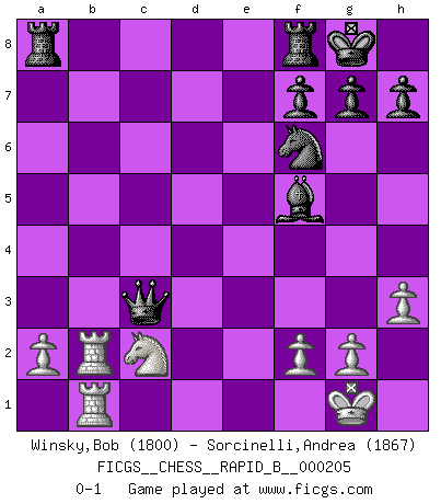 Last move : 0-1 2013 April 1 13:19:26 [Event "FICGS__CHESS__RAPID_B__000205"] [Site "FICGS"] [Date "2013.03.22"] [Round "1"] [White "Winsky,Bob"] [Black "Sorcinelli,Andrea"] [Result "0-1"] [WhiteElo "1800"] [BlackElo "1867"] 1.e4 e5 2.Bc4 Nf6 3.Qf3 Bc5 4.c3 O-O 5.b4 Be7 6.Ba3 c6 7.b5 d5 8.Bxe7 Qxe7 9.exd5 cxd5 10.Bxd5 e4 11.Bxe4 Nxe4 12.Ne2 Nf6 13.O-O Bg4 14.Qxb7 Qxb7 15.Nd4 a6 16.Na3 axb5 17.Naxb5 Nc6 18.h3 Nxd4 19.Nxd4 Bd7 20.Rab1 Qd5 21.Nc2 Qxd2 22.Rb2 Qxc3 23.Rfb1 Bf5 0-1 Bishop's Opening : Berlin defense Kingside Castling by player Black (move 4) Kingside Castling by player White (move 13) Player Black won this chess game. Follow this game move after move (download)By this measure (on the gap between Fischer & his contemporaries), I consider him the greatest world champion. (Garry Kasparov) Das Schachspiel ist ein See, in welchem eine Mücke baden und ein Elefant ertrinken kann. (Emanuel Lasker) El jugador blanco perdió porque fallo en recordar la coreccta continuación y tuvo que pensar por sí mismo las movidas. (Siegbert Tarrasch) Les échecs sont un jeu par leur forme, un art par leur essence et une science par sa difficulté d'acquisition. Ils peuvent vous procurer autant de plaisir qu'un bon livre ou une belle musique, mais vous n'aurez une réelle joie que si vous arrivez à bien jouer. (Tigran Petrosian) There are two types of people in this world, good and bad. The good sleep better, but the bad seem to enjoy the waking hours much more. (Woody Allen)