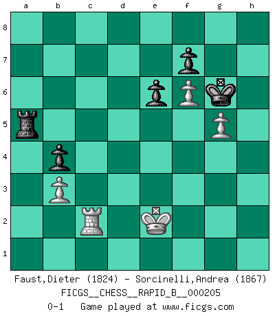 Last move : 0-1 2013 June 22 16:17:30 [Event "FICGS__CHESS__RAPID_B__000205"] [Site "FICGS"] [Date "2013.03.22"] [Round "1"] [White "Faust,Dieter"] [Black "Sorcinelli,Andrea"] [Result "0-1"] [WhiteElo "1824"] [BlackElo "1867"] 1.Nf3 Nf6 2.c4 c6 3.Nc3 d5 4.d4 e6 5.Bg5 dxc4 6.e4 b5 7.e5 h6 8.Bh4 g5 9.Nxg5 hxg5 10.Bxg5 Nbd7 11.g3 Bb7 12.exf6 Qb6 13.Bg2 O-O-O 14.O-O Ne5 15.Nd5 cxd5 16.dxe5 d4 17.a4 Bxg2 18.Kxg2 Qc6+ 19.f3 b4 20.h4 a5 21.Re1 c3 22.Qd3 Bc5 23.Rab1 Bb6 24.Ra1 Kb7 25.Re2 Rd5 26.b3 Bc7 27.Bf4 Qa6 28.Rd1 Qxd3 29.Rxd3 Rh5 30.Kf2 Kc6 31.Re4 Bxe5 32.Bxe5 Rhxe5 33.Ke2 Kd6 34.g4 Rxe4+ 35.fxe4 Rc5 36.Rxd4+ Ke5 37.Rd1 Kxe4 38.Rf1 Rc8 39.g5 Rg8 40.Rd1 Kf5 41.Rd7 Kg6 42.Ra7 Rh8 43.Rxa5 Rxh4 44.Rb5 Rd4 45.a5 c2 46.Rc5 Rd5 47.Rxc2 Rxa5 0-1 Reti Opening Queenside Castling by player Black (move 13) Kingside Castling by player White (move 14) 10 pieces endgame at move 47 : White KRPPP , Black KRPPP WHITE : King + 1 Rook 3 Pawns BLACK : King + 1 Rook 3 Pawns Player Black won this chess game. Follow this game move after move (download)You may learn much more from a game you lose than from a game you win. You will have to lose hundreds of games before becoming a good player. (Jose Raul Capablanca) Mit Schach schule ich mein Gefühl für Geometrie, was für Tennis und Schach gleichermaßen wichtig ist. (Boris Becker) Los libros de Ajedrez deben de usarse igual como usamos los anteojos: para mejorar la vista, aunque algunos jugadores los quieren usar como si ellos les otorgaran la vision. (José Raúl Capablanca) On n'a jamais que l'âge auquel on a commence à jouer aux échecs car après on cesse de vieillir. (Capablanca) Men should grow up. - Yeah. And dogs should stop licking themselves. It's not gonna happen. (Gregory House to Dr. Cameron, House M.D.)
