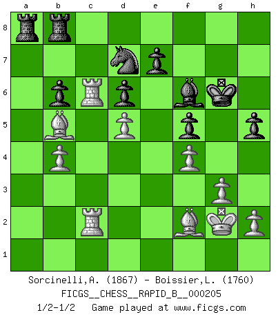 Last move : 1/2-1/2 2013 April 29 20:8:39 [Event "FICGS__CHESS__RAPID_B__000205"] [Site "FICGS"] [Date "2013.03.22"] [Round "1"] [White "Sorcinelli,Andrea"] [Black "Boissier,Lucien"] [Result "1/2-1/2"] [WhiteElo "1867"] [BlackElo "1760"] 1.e4 c5 2.Nf3 Nc6 3.d4 cxd4 4.Nxd4 g6 5.c4 Nf6 6.Nc3 Bg7 7.Be3 O-O 8.Be2 d6 9.O-O Bd7 10.Qd2 Nxd4 11.Bxd4 Bc6 12.f3 a5 13.b3 Nd7 14.Be3 Nc5 15.Rad1 Qb6 16.Nd5 Bxd5 17.cxd5 Qb4 18.Rc1 Rfc8 19.Rfd1 h5 20.Rc2 Qxd2 21.R1xd2 Bf6 22.Bb5 b6 23.Rd1 Be5 24.Rb1 Ra7 25.a3 Rca8 26.g3 Kg7 27.Kg2 f5 28.b4 axb4 29.axb4 Nd7 30.f4 Bf6 31.exf5 gxf5 32.Bf2 Kg6 33.Re1 Rb8 34.R1e2 Nf8 35.Rc6 Nd7 36.Rec2 R7a8 1/2-1/2 Sicilian : Accelerated Fianchetto, Maroczy bind Kingside Castling by player Black (move 7) Kingside Castling by player White (move 9) This chess game ended in a draw. Follow this game move after move (download)There's never before been a Chess player with such a thorough knowledge of the intricacies of the game and such an absolutely indomitable will to win. I think Bobby is the greatest player that ever lived. (Lisa Lane) Schach ist ein Kampf gegen den Fehler. (Johannes Herrman Zukertort) Es muy difícil jugar en contra de la teoría de Einstein. - en su primera derrota en contra de Fischer (Mikhail Tal) Il n'y a plus de joueurs du niveau de Jacob Murray dont la seule quête est le beau jeu, le plaisir de voir les pièces construire quelque chose. Sur 10 idées à la minute, 9 seront sans intérêt, la dernière s'avèrera géniale. (Christian Bauer) Never was anything great achieved without danger. (Niccolo Machiavelli)