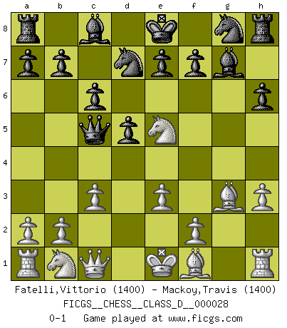 Last move : 0-1 2007 May 15 9:12:8 [Event "FICGS__CHESS__CLASS_D__000028"] [Site "FICGS"] [Date "2007.01.27"] [Round "1"] [White "Fatelli,Vittorio"] [Black "Mackoy,Travis"] [Result "0-1"] [WhiteElo "1400"] [BlackElo "1400"] 1.d4 d5 2.Bg5 h6 3.Bh4 c6 4.Nf3 Qb6 5.Qc1 g5 6.Bg3 g4 7.Ne5 Qxd4 8.e3 Qc5 9.c3 Bg7 10.h3 gxh3 11.gxh3 Nd7 0-1 Levitsky attack (Queen's Bishop attack) Player Black won this chess game. Follow this game move after move (download)If I win a tournament, I win it by myself. I do the playing. Nobody helps me. (Bobby Fischer) Wenn ich einen Club besuche, sind die Spieler stumm vor Staunen. (José Raúl Capablanca) Algunos sacrificios son sólidos, los demás son míos. (Mikhail Tal) Le joueur d'Echecs qui veut atteindre le top est obligé de développer son propre credo créatif. Alexeï Stepanovicth Souétine. Il est facile d'écrire des livres ! Ce qui est difficile, c'est de jouer ! (Alexeï Stepanovicth Souétine) I would love to change the world, but they won't give me the source code. (Unknown)