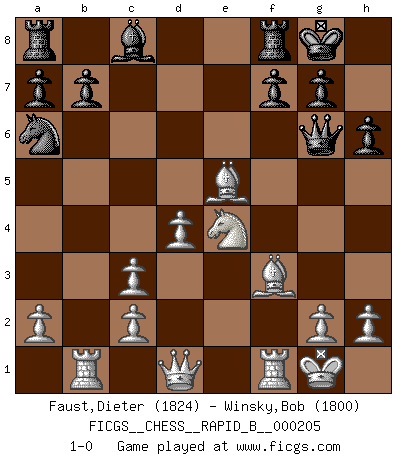 Last move : 1-0 2013 April 9 16:38:26 [Event "FICGS__CHESS__RAPID_B__000205"] [Site "FICGS"] [Date "2013.03.22"] [Round "1"] [White "Faust,Dieter"] [Black "Winsky,Bob"] [Result "1-0"] [WhiteElo "1824"] [BlackElo "1800"] 1.e4 e5 2.f4 exf4 3.Nf3 d5 4.exd5 Qxd5 5.Nc3 Qe6+ 6.Be2 Qb6 7.d4 Bb4 8.Bxf4 Bxc3+ 9.bxc3 Nf6 10.O-O Ng4 11.Rb1 Qf6 12.Ng5 h6 13.Bxg4 O-O 14.Ne4 Qc6 15.Bf3 Qg6 16.Bxc7 Na6 17.Be5 1-0 KGA : Abbazia defense (Classical defense, Modern defense!) Kingside Castling by player White (move 10) Kingside Castling by player Black (move 13) Player White won this chess game. Follow this game move after move (download)I have added these principles to the law: get the Knights into action before both Bishops are developed. (Emanuel Lasker) Heutzutage gewinnt im Turnier nicht derjenige Spieler, der weitreichende Pläne entwirft, sondern einfach jener, der Zug um Zug kämpft. (David Bronstein) La última cosa en que Fischer estaba interesado era en tonterías, siempre y cuando el Ajedrez estuviera involucrado. (Elie Agur) Les échecs sont un jeu terrible. Si vous n'avez pas le centre, votre adversaire a une position plus libre. Par contre, si vous avez le centre, alors vous avez vraiment quelque chose pour laquelle vous inquiéter ! (Siegbert Tarrasch) The production of too many useful things results in too many useless people. (Karl Marx)