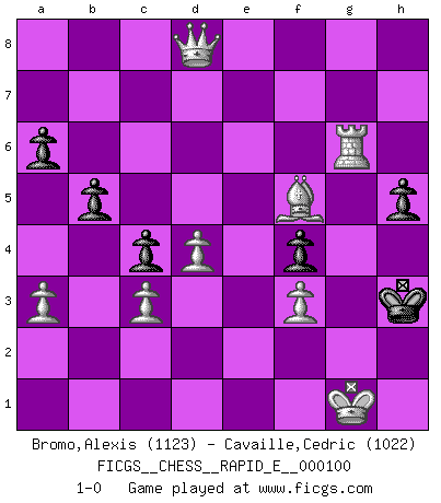 Last move : 1-0 2013 March 26 20:13:25 [Event "FICGS__CHESS__RAPID_E__000100"] [Site "FICGS"] [Date "2013.03.24"] [Round "1"] [White "Bromo,Alexis"] [Black "Cavaille,Cedric"] [Result "1-0"] [WhiteElo "1123"] [BlackElo "1022"] 1.d4 d5 2.c4 dxc4 3.Nc3 a6 4.e4 e6 5.Bxc4 b5 6.Bb3 Bb4 7.a3 Bxc3+ 8.bxc3 Nf6 9.Qc2 O-O 10.Nf3 Bb7 11.Bg5 h6 12.Bxf6 Qxf6 13.e5 Qe7 14.Qd3 c5 15.Bc2 g6 16.h4 h5 17.Ng5 c4 18.Qe3 f5 19.f3 Kg7 20.O-O Nc6 21.g4 Rh8 22.gxf5 exf5 23.e6 Nd8 24.Rad1 Bd5 25.Qe5+ Qf6 26.Qxd5 Nxe6 27.Nxe6+ Kh6 28.Ng5 Rhe8 29.Rfe1 Re7 30.Qxa8 Rxe1+ 31.Rxe1 f4 32.Re6 Qxg5+ 33.hxg5+ Kxg5 34.Rxg6+ Kh4 35.Qd8+ Kh3 36.Bf5+ 1-0 Queen's gambit accepted Kingside Castling by player Black (move 9) Kingside Castling by player White (move 20) Player White won this chess game. Follow this game move after move (download)The King is a fighting piece. Use it ! (Wilhelm Steinitz) Ein Teil des Fehlers ist immer korrekt. (Savielly Grigorievitsch Tartakower) El Ajedrez te enseña a controlarl la excitación inicial que sientes cuando vez algo que parece bueno y te enseña a pensar objetivamente cuando te encuentras en problemas. (Stanley Kubrick) Seul un grand joueur sait à quel point il joue faiblement. (Xavier Tartacover) We need strong personalities and only one world champion to attract sponsors. (Anatoly Karpov)