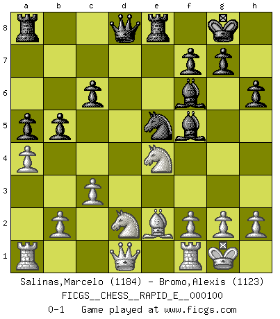 Last move : 0-1 2013 May 11 22:16:18 [Event "FICGS__CHESS__RAPID_E__000100"] [Site "FICGS"] [Date "2013.03.24"] [Round "1"] [White "Salinas,Marcelo"] [Black "Bromo,Alexis"] [Result "0-1"] [WhiteElo "1184"] [BlackElo "1123"] 1.Nf3 d5 2.Nd4 e5 3.Nb3 Nf6 4.d4 Nc6 5.Bg5 Be7 6.dxe5 Nxe5 7.Bxf6 Bxf6 8.Nc3 c6 9.e4 dxe4 10.Nd2 O-O 11.Ncxe4 Re8 12.Be2 h6 13.O-O a5 14.a4 b5 15.c3 Bf5 0-1 Reti Opening Kingside Castling by player Black (move 10) Kingside Castling by player White (move 13) Player Black won this chess game. Follow this game move after move (download)Do you realize Fischer almost never has any bad pieces? He exchanges them, and the bad pieces remain with his opponents. (Yuri Balashov) Es war undenkbar für die Behörden, dass ein sowjetischer Großmeister auf diese Art und Weise [Fischer-Taimanov 6:0] verliert, ohne dass es eine politischer Erklärung dafür gäbe. (Mark Taimanov) No solamente yo pronostico su triunfo sobre Botvinnik, sino que me adelanto y digo que probablemente Fischer es el jugador de Ajedrez mas grande que haya existido. (John Collins) Celui qui prend des risques peut perdre, celui qui n'en prend pas perd toujours. (Xavier Tartacover) It's not a bug - it's an undocumented feature. (Anonymous)