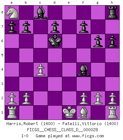 Last move : 1-0 2007 May 5 19:56:47 [Event "FICGS__CHESS__CLASS_D__000028"] [Site "FICGS"] [Date "2007.01.27"] [Round "1"] [White "Harris,Robert"] [Black "Fatelli,Vittorio"] [Result "1-0"] [WhiteElo "1400"] [BlackElo "1400"] 1.c4 c5 2.Nc3 e5 3.Nf3 Nc6 4.e3 g6 5.d4 exd4 6.exd4 Nxd4 7.Nxd4 cxd4 8.Qxd4 Nf6 9.Bg5 Bg7 10.Nd5 Kf8 11.Nxf6 h6 12.Qd6+ Qe7 13.Qxe7+ Kxe7 14.Nd5+ Kd6 15.Bf4+ Be5 16.Nc7 Bxf4 17.Nxa8 1-0 This chess game has been lost on time (started : 2007.01.27 6:20:21) English : Symmetrical variation Player White won this chess game. Follow this game move after move (download)I give 98 percent of my mental energy to Chess. Others give only 2 percent. (Bobby Fischer) Sie führen leise Selbstgespräche, schlürfen lautstark ihre Getränke, schmatzen hörbar beim Essen, blasen ihrem Gegenüber Rauch in die Augen, niesen ihm ins Gesicht, starren ihn unverwandt an, bis er sich unter ihren Blicken windet, rutschen ständig auf ihrem Stuhl hin und her, rülpsen und bohren in der Nase. (Anonymous) La belleza de un movimiento no se refleja solo en su apariencia, sino en el pensamiento detrás de él. (Siegbert Tarrasch) Plusieurs personnes se sont demandées comment Tal faisait pour gagner... En fait, c'est très simple ! Il met ses pièces au centre de l'échiquier et les sacrifie quelque part ! (David Bronstein) Cactus - It is depressed cucumber. (Ilmars Cirulis)