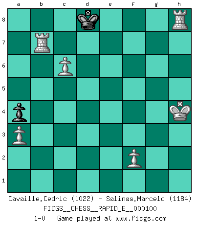 Last move : 1-0 2013 June 18 13:17:32 [Event "FICGS__CHESS__RAPID_E__000100"] [Site "FICGS"] [Date "2013.03.24"] [Round "1"] [White "Cavaille,Cedric"] [Black "Salinas,Marcelo"] [Result "1-0"] [WhiteElo "1022"] [BlackElo "1184"] 1.d4 e6 2.c4 d6 3.e4 Nf6 4.Nc3 d5 5.cxd5 exd5 6.exd5 Nxd5 7.Nxd5 Qxd5 8.Be2 Bb4+ 9.Kf1 O-O 10.a3 Ba5 11.b4 Bb6 12.Nf3 Nc6 13.Bb2 Bg4 14.b5 Bxf3 15.Bxf3 Qc4+ 16.Be2 Qb3 17.Qxb3 Bxd4 18.bxc6 Bxb2 19.Qxb2 b6 20.Qe5 Rac8 21.Bd3 Rcd8 22.Qe4 g6 23.h4 h5 24.g3 Rfe8 25.Qc4 Re6 26.Kg2 R8d6 27.Be4 f5 28.Qxe6+ Rxe6 29.Bd5 Kf7 30.Bxe6+ Kxe6 31.Rad1 a6 32.Rhe1+ Kf6 33.Rd7 f4 34.Rxc7 g5 35.hxg5+ Kxg5 36.gxf4+ Kxf4 37.Rf7+ Kg5 38.Kh3 a5 39.Re5+ Kg6 40.Rf8 Kg7 41.R8f5 Kg6 42.Kh4 b5 43.Rxb5 a4 44.Rxh5 Kf6 45.Rh6+ Ke7 46.Rb7+ Kd8 47.Rh8+ 1-0 This chess game has been lost on time (started : 2013.03.24 10:8:52) Queen's pawn Kingside Castling by player Black (move 9) 10 pieces endgame at move 36 : White KRRPPP , Black KPPP WHITE : King + 2 Rooks 3 Pawns BLACK : King + 3 Pawns 9 pieces endgame at move 43 : White KRRPPP , Black KPP WHITE : King + 2 Rooks 3 Pawns BLACK : King + 2 Pawns 8 pieces endgame at move 44 : White KRRPPP , Black KP WHITE : King + 2 Rooks 3 Pawns BLACK : King + 1 Pawn Player White won this chess game. Follow this game move after move (download)I feel as if I were a piece in a game of Chess, when my opponent says of it: That piece cannot be moved. (Soren Kierkegaard) Wenn du auf das Glück wartest, wird das Leben ziemlich langweilig. (Mikhail Nekhemyevich Tal) Los finales de Peón son del Ajedrez lo que el cesped es del Golf. (Cecil Purdy) Pour moi, les échecs ne sont pas un jeu mais un art. (Alexandre Alekhine) Tree pose grows confidence. It roots me to this world. (Terri Guillemets)