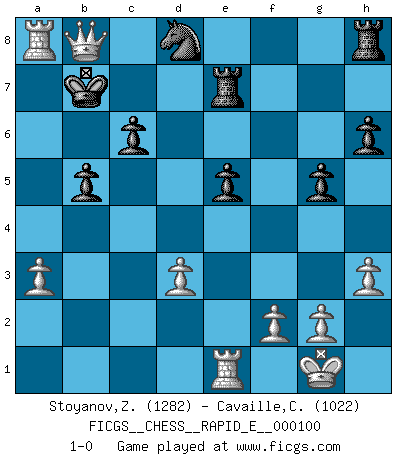 Last move : 1-0 2013 March 25 17:42:59 [Event "FICGS__CHESS__RAPID_E__000100"] [Site "FICGS"] [Date "2013.03.24"] [Round "1"] [White "Stoyanov,Zdravko"] [Black "Cavaille,Cedric"] [Result "1-0"] [WhiteElo "1282"] [BlackElo "1022"] 1.e4 e5 2.Nf3 Nf6 3.d3 d6 4.h3 Nc6 5.a3 Be6 6.Ng5 Be7 7.Nxe6 fxe6 8.Be2 d5 9.O-O Qd7 10.exd5 exd5 11.Nd2 O-O-O 12.Re1 d4 13.Ne4 Nxe4 14.Bg4 Qxg4 15.Qxg4+ Kb8 16.Qxe4 h6 17.b4 a6 18.Rb1 g5 19.Bd2 Rdf8 20.c3 dxc3 21.Bxc3 Bd6 22.Qd5 Re8 23.b5 axb5 24.Qxb5 Nd8 25.Ba5 Re7 26.Bb4 Bxb4 27.Rxb4 Kc8 28.Qa5 b6 29.Qa8+ Kd7 30.Qd5+ Kc8 31.Ra4 c6 32.Qd6 b5 33.Ra8+ Kb7 34.Qb8+ 1-0 Petrov's defense Kingside Castling by player White (move 9) Queenside Castling by player Black (move 11) Player White won this chess game. Follow this game move after move (download)You sit at the board and suddenly your heart leaps. Your hand trembles to pick up the piece and move it. But what Chess teaches you is that you must sit there calmly and think about whether it's really a good idea and whether there are other better ideas. (Stanley Kubrick) Schach ist ein schwarz-weisser Dschungel. (Garry Kasparov) ¿Cual es el objetivo de jugar una apertura de gambito?... Para adquirir una reputación de ser un jugador apuesto a costo de perder el juego. (Siegbert Tarrasch) Les sacrifices démontrent seulement que quelqu'un a gaffé. (Savielly Tartacover) It is the aim of the modern school, not to treat every position according to one general law, but according to the principle inherent in the position. (Richard Reti)