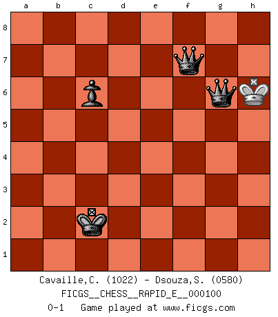Last move : 0-1 2013 April 15 12:13:42 [Event "FICGS__CHESS__RAPID_E__000100"] [Site "FICGS"] [Date "2013.03.24"] [Round "1"] [White "Cavaille,Cedric"] [Black "Dsouza,Stanislaus"] [Result "0-1"] [WhiteElo "1022"] [BlackElo "0580"] 1.d4 d5 2.Nc3 Nf6 3.Nf3 e6 4.e3 Bb4 5.Bd2 O-O 6.Be2 Nc6 7.O-O Bd7 8.a3 Bxc3 9.Bxc3 Ne4 10.Bd2 f5 11.c4 Qf6 12.c5 e5 13.dxe5 Nxe5 14.Nxe5 Qxe5 15.b4 Nxd2 16.Qxd2 c6 17.Qd4 Qxd4 18.exd4 f4 19.f3 Bf5 20.g4 Bg6 21.h4 h5 22.Rad1 hxg4 23.fxg4 Be4 24.Bf3 Rae8 25.g5 Bxf3 26.Rxf3 Re3 27.Rxe3 fxe3 28.Re1 Re8 29.Kg2 Kf7 30.Kf3 Kg6 31.Rxe3 Rxe3+ 32.Kxe3 Kf5 33.Kf3 g6 34.Kg3 b5 35.h5 Kxg5 36.hxg6 Kxg6 37.Kf4 Kf6 38.Ke3 Kf5 39.Kf3 a6 40.Ke3 Kg4 41.Kd3 Kf4 42.Kc3 Ke4 43.Kb3 Kxd4 44.a4 Kd3 45.axb5 axb5 46.Kb2 Kc4 47.Ka3 d4 48.Kb2 Kxb4 49.Kc2 Kxc5 50.Kd3 b4 51.Kc2 Kc4 52.Kd2 b3 53.Kc1 Kc3 54.Kb1 d3 55.Kc1 d2+ 56.Kd1 b2 57.Ke2 Kc2 58.Ke3 d1Q 59.Ke4 Qd5+ 60.Ke3 b1Q 61.Kf4 Qe1 62.Kg4 Qf7 63.Kg5 Qg1+ 64.Kh6 Qg1g6+ 0-1 Queen's pawn : Chigorin variation Kingside Castling by player Black (move 5) Kingside Castling by player White (move 7) 10 pieces endgame at move 36 : White KPPPP , Black KPPPP WHITE : King + 4 Pawns BLACK : King + 4 Pawns 9 pieces endgame at move 43 : White KPPP , Black KPPPP WHITE : King + 3 Pawns BLACK : King + 4 Pawns 8 pieces endgame at move 45 : White KPPP , Black KPPP WHITE : King + 3 Pawns BLACK : King + 3 Pawns 7 pieces endgame at move 45 : White KPP , Black KPPP WHITE : King + 2 Pawns BLACK : King + 3 Pawns 6 pieces endgame at move 48 : White KP , Black KPPP WHITE : King + 1 Pawn BLACK : King + 3 Pawns 5 pieces endgame at move 49 : White K , Black KPPP WHITE : King + BLACK : King + 3 Pawns Promotion Queen by player Black (move 58) Promotion Queen by player Black (move 60) Player Black won this chess game. Follow this game move after move (download)Do you realize Fischer almost never has any bad pieces? He exchanges them, and the bad pieces remain with his opponents. (Yuri Balashov) Er war ein guter Schachspieler, aber ich kann Leute nicht ausstehen, die 'Heil Hitler' rufen (Über Alexander Aljechin). (Miguel Najdorf) Sin errores no puede haber brillantez. (Emanuel Lasker) Votre prénom est 'Tactique', votre deuxième prénom est 'Tactique' et votre nom est 'Tactique'. (Ken Smith) The Internet is the first thing that humanity has build that humanity doesn't understand, the largest experiment in anarchy that we have ever had. (Eric Schmidt)