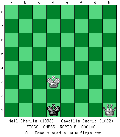 Last move : 1-0 2013 April 15 23:12:21 [Event "FICGS__CHESS__RAPID_E__000100"] [Site "FICGS"] [Date "2013.03.24"] [Round "1"] [White "Neil,Charlie"] [Black "Cavaille,Cedric"] [Result "1-0"] [WhiteElo "1093"] [BlackElo "1022"] 1.d4 d5 2.Nf3 Nc6 3.Bf4 Nf6 4.e3 e6 5.h3 Bb4+ 6.c3 Bd6 7.Bxd6 Qxd6 8.Bd3 O-O 9.O-O a6 10.Nbd2 b5 11.Qc2 Bb7 12.Ng5 g6 13.Rae1 Kg7 14.e4 dxe4 15.Ngxe4 Ne7 16.Nxd6 cxd6 17.a4 Bc6 18.axb5 Bxb5 19.Bxb5 axb5 20.Ne4 d5 21.Nxf6 Kxf6 22.g4 Rfc8 23.f4 h5 24.gxh5 gxh5 25.Re5 Nf5 26.Qg2 Rg8 27.Qxg8 Rxg8+ 28.Kh2 h4 29.Rg1 Ng3 30.Re3 Kf5 31.R1xg3 Rxg3 32.Rxg3 hxg3+ 33.Kxg3 f6 34.Kf3 e5 35.fxe5 fxe5 36.dxe5 Kxe5 37.Ke3 Kf5 38.Kd4 Ke6 39.b3 Kd6 40.h4 Kc6 41.b4 Kd6 42.h5 Ke7 43.Kxd5 Kf6 44.h6 Kg6 45.Kc6 Kxh6 46.Kxb5 Kg7 47.Kc6 Kf7 48.Kd7 Kf6 49.b5 Ke5 50.b6 Kd5 51.b7 Kc4 52.b8Q Kxc3 53.Qh2 Kc4 54.Kc6 Kd4 55.Qf4+ Kc3 56.Kb5 Kd3 57.Kb4 Ke2 58.Kc3 Ke1 59.Qh2 Kf1 60.Kd3 Ke1 61.Qg2 Kd1 62.Qh1+ 1-0 Queen's pawn game, Chigorin variation Kingside Castling by player Black (move 8) Kingside Castling by player White (move 9) 10 pieces endgame at move 35 : White KPPPPP , Black KPPP WHITE : King + 5 Pawns BLACK : King + 3 Pawns 9 pieces endgame at move 35 : White KPPPP , Black KPPP WHITE : King + 4 Pawns BLACK : King + 3 Pawns 8 pieces endgame at move 36 : White KPPPP , Black KPP WHITE : King + 4 Pawns BLACK : King + 2 Pawns 7 pieces endgame at move 36 : White KPPP , Black KPP WHITE : King + 3 Pawns BLACK : King + 2 Pawns 6 pieces endgame at move 43 : White KPPP , Black KP WHITE : King + 3 Pawns BLACK : King + 1 Pawn 5 pieces endgame at move 45 : White KPP , Black KP WHITE : King + 2 Pawns BLACK : King + 1 Pawn 4 pieces endgame at move 46 : White KPP , Black K WHITE : King + 2 Pawns BLACK : King + Promotion Queen by player White (move 52) 3 pieces endgame at move 52 : White KQ , Black K WHITE : King + 1 Queen BLACK : King + Player White won this chess game. Follow this game move after move (download)Pawn endings are to Chess what putting is to golf. (Cecil Purdy) Zeige mir drei Eröffnungsvarianten und ich beweise dir, dass zwei davon inkorrekt sind. (Emanuel Lasker) Después de una mala apertura, hay una esperanza en el juego medio. Pero una vez que estas en finales, el momento de la verdad ha llegado. (Edmar Mednis) Il n'y a plus de joueurs du niveau de Jacob Murray dont la seule quête est le beau jeu, le plaisir de voir les pièces construire quelque chose. Sur 10 idées à la minute, 9 seront sans intérêt, la dernière s'avèrera géniale. (Christian Bauer) Hold em is to stud what chess is to checkers. (Johnny Moss)