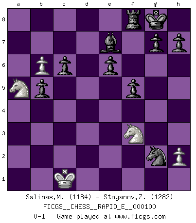 Last move : 0-1 2013 June 4 12:18:21 [Event "FICGS__CHESS__RAPID_E__000100"] [Site "FICGS"] [Date "2013.03.24"] [Round "1"] [White "Salinas,Marcelo"] [Black "Stoyanov,Zdravko"] [Result "0-1"] [WhiteElo "1184"] [BlackElo "1282"] 1.Nf3 c5 2.d4 e6 3.Bg5 Be7 4.dxc5 Bxg5 5.Qd4 Bf6 6.Qb4 Nc6 7.Qb3 Nh6 8.e4 O-O 9.e5 Nxe5 10.Nbd2 Nc6 11.c4 Qa5 12.Qb5 Qxb5 13.cxb5 Nb4 14.Kd1 Bxb2 15.Rb1 Bc3 16.a3 Na2 17.Ne4 f5 18.Nd6 Bf6 19.b6 Nc3+ 20.Kc2 Nxb1 21.Kxb1 Ng4 22.Be2 Nxf2 23.Rc1 Ng4 24.Bb5 a6 25.Nxc8 axb5 26.Nd6 Rxa3 27.Nxb7 Ra1+ 28.Kc2 Ne3+ 29.Kd2 Rxc1 30.Kxc1 Nxg2 31.Na5 Be7 32.c6 dxc6 0-1 This chess game has been lost on time (started : 2013.03.24 10:8:52) Reti Opening Kingside Castling by player Black (move 8) Player Black won this chess game. Follow this game move after move (download)My opponents make good moves too. Sometimes I don't take these things into consideration. (Bobby Fischer) Es ist im Leben wie im Schachspiel. Wir entwerfen einen Plan, dieser bleibt jedoch bedingt durch das, was im Schachspiel dem Gegner, im Leben dem Schicksal zu tun belieben wird. (Arthur Schopenhauer) No volvere nunca a jugar contigo. Has insultado a mi amigo. - cuando un oponente se maldijo por una mala jugada (Miguel Najdorf) La vie est comme un jeu d'échecs : nous esquissons un plan, mais celui-ci est tributaire de ce que daignent faire l'adversaire aux échecs et le destin dans la vie. (Arthur Schopenhauer) Ah, beer! The cause of, and the solution to, all of life's problems. (Homer Simpson)