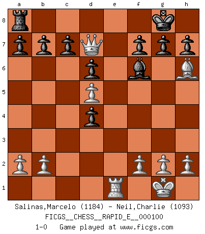Last move : 1-0 2013 May 18 23:3:51 [Event "FICGS__CHESS__RAPID_E__000100"] [Site "FICGS"] [Date "2013.03.24"] [Round "1"] [White "Salinas,Marcelo"] [Black "Neil,Charlie"] [Result "1-0"] [WhiteElo "1184"] [BlackElo "1093"] 1.e4 e5 2.Bc4 Nf6 3.Qf3 Nc6 4.Ne2 d6 5.Nbc3 Be6 6.Bd5 Bxd5 7.Nxd5 Be7 8.d3 Nxd5 9.exd5 Nb4 10.O-O Nxc2 11.Rb1 O-O 12.d4 Nxd4 13.Nxd4 exd4 14.Qg4 Bf6 15.Bh6 Re8 16.Rbe1 Rxe1 17.Rxe1 Qd7 18.Qxd7 1-0 Bishop's Opening : Berlin defense Kingside Castling by player White (move 10) Kingside Castling by player Black (move 11) Player White won this chess game. Follow this game move after move (download)The chessboard is the world, the pieces are the phenomena of the Universe, the rules of the game are what we call the laws of Nature and the player on the other side is hidden from us. (Thomas Huxley) Kasparov stellt für gewöhnlich die Regeln auf und bricht sie dann selbst wieder. (Alexej Shirov) Prefiero perder una partida realmente buena, que ganar una mala. (David Levy) A ce moment-là, je menaçais de comprendre la position ! (Clément L'Heureux) Wawaweewa ! (Borat: Cultural learnings of America for make benefit glorious nation of Kazakhstan)