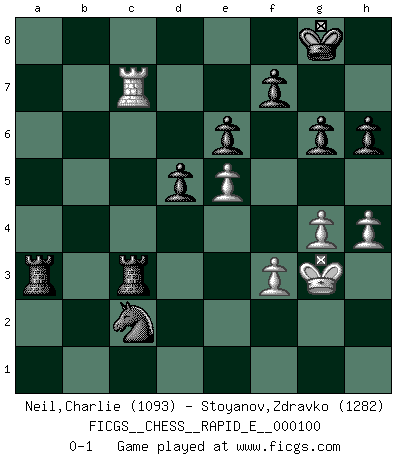 Last move : 0-1 2013 April 15 20:22:32 [Event "FICGS__CHESS__RAPID_E__000100"] [Site "FICGS"] [Date "2013.03.24"] [Round "1"] [White "Neil,Charlie"] [Black "Stoyanov,Zdravko"] [Result "0-1"] [WhiteElo "1093"] [BlackElo "1282"] 1.d4 d5 2.Nf3 h6 3.h3 e6 4.Bf4 Bd6 5.Bxd6 Qxd6 6.c4 Qb4+ 7.Nc3 Qxc4 8.e4 Qb4 9.e5 Ne7 10.Bd3 Qxb2 11.Qc1 Qxc1+ 12.Rxc1 O-O 13.Nb5 Na6 14.Nxc7 Nxc7 15.O-O Nc6 16.Rc5 a6 17.Rfc1 Bd7 18.a4 b6 19.R5c2 b5 20.axb5 Nxb5 21.Nd2 Nbxd4 22.Rc5 Rfb8 23.Kf1 Rb2 24.Nb1 Nb3 25.Rxc6 Bxc6 26.Rxc6 a5 27.Nc3 Nd4 28.Rc7 a4 29.Nxa4 Rb3 30.Nc3 g6 31.g4 Nf3 32.Bc2 Ra1+ 33.Kg2 Ne1+ 34.Kg3 Nxc2 35.h4 R1a3 36.f3 Rxc3 0-1 Queen's pawn game Kingside Castling by player Black (move 12) Kingside Castling by player White (move 15) Player Black won this chess game. Follow this game move after move (download)Chess is played with the mind and not with the hands ! (Renaud and Kahn) Mein Name ist Rustam Kamsky. Sie haben meinen Sohn belästigt. Bereiten Sie sich aufs Sterben vor. (Rustam Kamsky) Me gusta decir que Bobby Fischer fue el mejor jugador que jamás haya existido. Pero lo que hizo de Fischer un genio, fue su habilidad de mezclar una frescura y pragmatismo Americano con ideas Rusas acerca de la estrategia. (Bruce Pandolfini) Demandez au pauvre Cg1 ce qu'il en pense. Eduard Gufeld à propos de la variante Saemisch de l'Est-Indienne. Life is painting a picture, not doing a sum. (Oliver Wendell Holmes, Jr.)