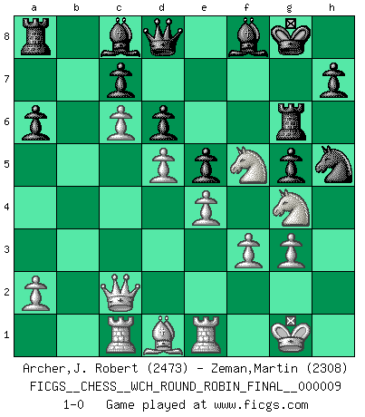 Last move : 1-0 2013 September 7 1:25:6 [Event "FICGS__CHESS__WCH_ROUND_ROBIN_FINAL__000009"] [Site "FICGS"] [Date "2013.03.24"] [Round "1"] [White "Archer,J. Robert"] [Black "Zeman,Martin"] [Result "1-0"] [WhiteElo "2473"] [BlackElo "2308"] 1.d4 Nf6 2.c4 g6 3.Nc3 Bg7 4.e4 d6 5.Nf3 O-O 6.Be2 e5 7.O-O Nc6 8.d5 Ne7 9.Ne1 Nd7 10.Be3 f5 11.f3 f4 12.Bf2 g5 13.Rc1 Rf6 14.Nd3 b6 15.b4 Rh6 16.c5 a6 17.Re1 Nf6 18.h3 Nh5 19.Qc2 Ng3 20.Bd1 bxc5 21.bxc5 Ng6 22.Bxg3 fxg3 23.Ne2 Bxh3 24.Nxg3 Bc8 25.Nf2 Nf4 26.Ng4 Rg6 27.Nf5 Bf8 28.g3 Nh5 29.c6 1-0 This chess game has been lost on time (started : 2013.03.24 22:1:37) King's Indian : Orthodox, Aronin-Taimanov variation (Yugoslav attack / Mar del Plata variation) Kingside Castling by player Black (move 5) Kingside Castling by player White (move 7) Player White won this chess game. Follow this game move after move (download)Could we look into the head of a Chess player, we should see there a whole world of feelings, images, ideas, emotion and passion. (Alfred Binet) Die größte Kunst beim Schach besteht darin dem Gegner nicht zu zeigen was er tun kann. (Garry Kasparov) Nada excita más a Grandes Maestros aburridos que una novedad teórica. (Dominic Lawson) Il vaut toujours mieux jouer un plan faux de façon logique que de n'avoir pas de plan du tout. (Victor Kortchnoï) Humor is by far the most significant activity of the human brain. (Edward De Bono)