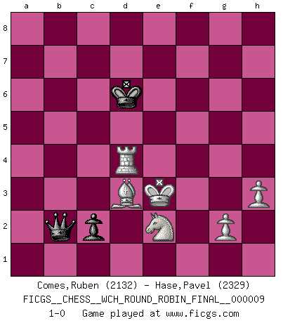 Last move : 1-0 2013 September 28 9:6:58 [Event "FICGS__CHESS__WCH_ROUND_ROBIN_FINAL__000009"] [Site "FICGS"] [Date "2013.03.24"] [Round "1"] [White "Comes,Ruben"] [Black "Hase,Pavel"] [Result "1-0"] [WhiteElo "2132"] [BlackElo "2329"] 1.e4 e5 2.Nf3 Nc6 3.Bb5 a6 4.Ba4 Nf6 5.O-O Be7 6.Re1 b5 7.Bb3 O-O 8.c3 d6 9.h3 Nb8 10.d4 Nbd7 11.c4 b4 12.c5 Bb7 13.Qc2 exd4 14.c6 d3 15.Qc4 Nb6 16.cxb7 Nxc4 17.bxa8Q Qxa8 18.Bxc4 Nxe4 19.Bxd3 d5 20.a3 a5 21.Bf4 f5 22.axb4 Bxb4 23.Nc3 c6 24.Rec1 Bc5 25.Nd1 a4 26.Rc2 Qb7 27.Be3 Bd6 28.Nc3 Nxc3 29.bxc3 f4 30.Bc1 Ra8 31.Nd4 g6 32.Rca2 c5 33.Nf3 c4 34.Be2 Qb3 35.Ba3 Bf8 36.Bxf8 Kxf8 37.Ra3 Qb2 38.Nd4 Re8 39.Kf1 Qd2 40.Rd1 Qb2 41.Rxa4 Qxc3 42.Bf3 Re5 43.Ra8+ Kg7 44.Nc6 Rf5 45.Ne7 Rf7 46.Nxd5 Qb2 47.R8a1 Rd7 48.Nxf4 Rxd1+ 49.Rxd1 h5 50.Ne2 h4 51.Bd5 Qb5 52.f3 Qc5 53.Be4 Qa5 54.Rd7+ Kf6 55.f4 g5 56.fxg5+ Qxg5 57.Rd5 Qg8 58.Rd4 Qc8 59.Bd5 c3 60.Rxh4 Qc5 61.Be4 Qa3 62.Rf4+ Ke5 63.Bd3 Qb3 64.Kf2 c2 65.Re4+ Kd6 66.Ke3 Qb2 67.Rd4+ 1-0 Ruy Lopez : Closed, 7...O-O Kingside Castling by player White (move 5) Kingside Castling by player Black (move 7) Promotion Queen by player White (move 17) 10 pieces endgame at move 56 : White KRBNPP , Black KQPP WHITE : King + 1 Rook 1 Bishop 1 Knight 2 Pawns BLACK : King + 1 Queen 2 Pawns 9 pieces endgame at move 60 : White KRBNPP , Black KQP WHITE : King + 1 Rook 1 Bishop 1 Knight 2 Pawns BLACK : King + 1 Queen 1 Pawn Player White won this chess game. Follow this game move after move (download)I give 98 percent of my mental energy to Chess. Others give only 2 percent. (Bobby Fischer) Wie bekannt hörte Morphy 1859 auf, Schach zu spielen. Seine Enttäuschung galt nicht so sehr dem Schach, wie den Schachspielern. (Robert James Fischer) Debemos de asegurarnos de que el Ajedrez no se convierta en un lenguaje muerto, muy interesante, pero tan solo para un grupo muy pequeño. (Sytze Faber) Mais n'est-ce pas déjà le limiter injurieusement que d'appeler les échecs un jeu? N'est-ce pas aussi une science, un art, ou quelque chose qui, comme le cercueil de Mahomet entre ciel et terre, est suspendu entre l'un et l'autre, et qui réunit un nombre incroyable de contraires ? (Stefan Zweig) A computer lets you make more mistakes faster than any invention in human history - with the possible exceptions of handguns and tequila. (Mitch Ratcliffe)
