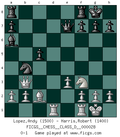 Last move : 0-1 2007 May 11 2:38:26 [Event "FICGS__CHESS__CLASS_D__000028"] [Site "FICGS"] [Date "2007.01.27"] [Round "1"] [White "Lopez,Andy"] [Black "Harris,Robert"] [Result "0-1"] [WhiteElo "1500"] [BlackElo "1400"] 1.d4 Nf6 2.c4 e6 3.Nf3 Bb4+ 4.Bd2 Qe7 5.e3 b6 6.Bd3 Bb7 7.O-O Bxd2 8.Qxd2 c5 9.dxc5 bxc5 10.Nc3 O-O 11.Rad1 Nc6 12.Bc2 d5 13.cxd5 exd5 14.Nxd5 Nxd5 15.Qxd5 Nb4 16.Qb3 Ba6 0-1 This chess game has been lost on time (started : 2007.01.27 6:20:21) Bogo-Indian defense, Nimzovich variation Kingside Castling by player White (move 7) Kingside Castling by player Black (move 10) Player Black won this chess game. Follow this game move after move (download)Could we look into the head of a Chess player, we should see there a whole world of feelings, images, ideas, emotion and passion. (Alfred Binet) Die Partien sind immer verschieden, die Interviews immer die gleichen. (Garry Kasparov) Me siento como si fuera una pieza en una partida de Ajedrez, cuando mi oponente me indica: esa pieza no puede ser movida. (Soren Kierkegaard) Si je n'étais pas joueur d'échecs, je serais le meilleur dans quelque chose d'autre. (Anatoli Karpov) I think your argument is specious - I think your tie is ugly. (Gregory House to Dr. Foreman, House M.D.)