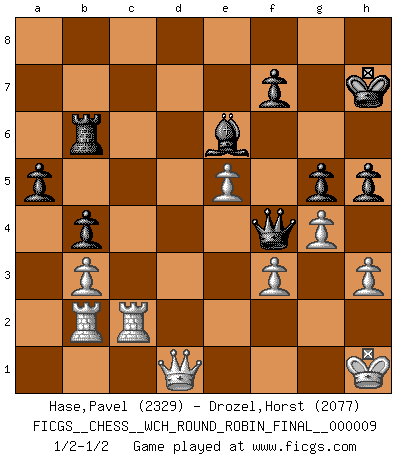 Last move : 1/2-1/2 2013 September 26 0:10:13 [Event "FICGS__CHESS__WCH_ROUND_ROBIN_FINAL__000009"] [Site "FICGS"] [Date "2013.03.24"] [Round "1"] [White "Hase,Pavel"] [Black "Drozel,Horst"] [Result "1/2-1/2"] [WhiteElo "2329"] [BlackElo "2077"] 1.e4 e5 2.Nf3 Nc6 3.Bb5 a6 4.Ba4 Nf6 5.O-O Be7 6.Re1 b5 7.Bb3 O-O 8.d4 d6 9.c3 Bg4 10.Be3 Bh5 11.h3 exd4 12.cxd4 Na5 13.Nbd2 c5 14.g4 Bg6 15.Bc2 Re8 16.Rc1 Rc8 17.Bf4 Nd7 18.d5 Nb6 19.b3 Bf6 20.Nf1 c4 21.Be3 Bb2 22.Rb1 Bc3 23.Re2 b4 24.Nd4 Nd7 25.Ng3 Nf6 26.f3 h5 27.Bf2 Rc7 28.bxc4 Rxc4 29.Ba4 Re5 30.Bb3 Nxb3 31.axb3 Rxd4 32.Bxd4 Bxd4+ 33.Qxd4 Nxd5 34.Rh2 Nf4 35.Qd2 Qf6 36.Nf5 Bxf5 37.Qxf4 g5 38.Qd2 Be6 39.Qxd6 a5 40.Rc2 Qf4 41.Qd1 Kh7 42.Kh1 Rb5 43.R1b2 Rb6 44.e5 1/2-1/2 Ruy Lopez : Closed, 7...O-O Kingside Castling by player White (move 5) Kingside Castling by player Black (move 7) This chess game ended in a draw. Follow this game move after move (download)Not only will I predict his triumph over Botvinnik, but I'll go further and say that he'll probably be the greatest Chess player that ever lived. (John Collins) Spiel ein langweiliges Spiel zu Ende und lustige Dinge können passieren. (Hans Ree) Buenas posiciones no logran ganar juegos, buenas movidas sí. (Gerald Abrahams) Que feriez-vous si vous étiez en train de jouer aux échecs et que la fin du monde arrive ? Je continuerais à jouer. (Saint Borromée) Children in the dark cause accidents, accidents in the dark cause children. (Unknown)