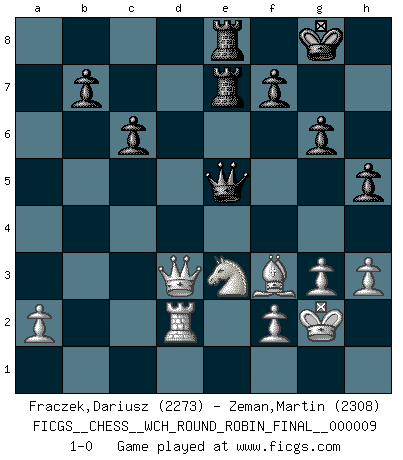 Last move : 1-0 2013 September 6 13:24:18 [Event "FICGS__CHESS__WCH_ROUND_ROBIN_FINAL__000009"] [Site "FICGS"] [Date "2013.03.24"] [Round "1"] [White "Fraczek,Dariusz"] [Black "Zeman,Martin"] [Result "1-0"] [WhiteElo "2273"] [BlackElo "2308"] 1.d4 Nf6 2.c4 g6 3.g3 Bg7 4.Bg2 d5 5.cxd5 Nxd5 6.Nf3 Nb6 7.Nc3 Nc6 8.e3 O-O 9.O-O Re8 10.Re1 a5 11.Qe2 Bg4 12.h3 Be6 13.Rd1 Bc4 14.Qc2 a4 15.Qb1 Qd7 16.Nd2 Be6 17.d5 Nxd5 18.Nxd5 Bxd5 19.Nf1 e6 20.e4 Nd4 21.exd5 Ne2+ 22.Kh2 a3 23.Rd2 Nxc1 24.Qxc1 exd5 25.bxa3 Bxa1 26.Rxd5 Qe7 27.Qxa1 c6 28.Rd2 Qxa3 29.Ne3 h5 30.Qb1 Qe7 31.Rb2 Qf6 32.Re2 Qe7 33.Bf3 Qc7 34.Kg2 Re5 35.Qa1 Rae8 36.Rd2 R5e7 37.Qd4 Qe5 38.Qd3 1-0 This chess game has been lost on time (started : 2013.03.24 22:1:37) King's Indian : 3.g3, counterthrust variation Kingside Castling by player Black (move 8) Kingside Castling by player White (move 9) Player White won this chess game. Follow this game move after move (download)I love all positions. Give me a difficult positional game, I will play it. But totally won positions, I cannot stand them. (Hein Donner) Schach ist gnadenlos. Du mußt bereit sein zu töten. (Nigel Short) Después de la respuesta de las negras a 1.e4 con 1..e5, se quedan siempre tratando de entrar dentro del juego. (Howard Staunton) Dans le domaine de la peinture, de la gravure et de la sculpture, dès la première décennie de notre siècle, les artistes abandonnent la représentation de la partie d'échecs pour se concentrer sur les pièces, sur les échiquiers et sur toutes les variations auxquelles les unes et les autres peuvent donner lieu. On passe en quelque sorte d'un thème social à un thème musical (au sens de la musica médiévale, c'est-à-dire d'une notion qui inclue le rythme, l'harmonie, la construction et la déconstruction, etc.). Graphiquement et picturalement, l'échiquier apparaît comme une structure ouverte, dynamique, d'une richesse infinie, autorisant toutes les combinatoires et débouchant sur des mouvements et des rythmes de nature exponentielle. (Michel Pastoureau) If I had no sense of humor, I would long ago have committed suicide. (Mahatma Gandhi)
