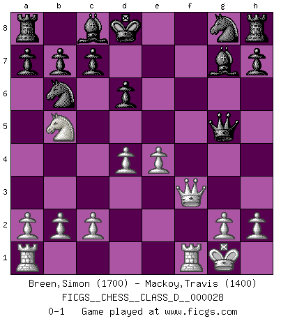 Last move : 0-1 2007 June 15 7:37:8 [Event "FICGS__CHESS__CLASS_D__000028"] [Site "FICGS"] [Date "2007.01.27"] [Round "1"] [White "Breen,Simon"] [Black "Mackoy,Travis"] [Result "0-1"] [WhiteElo "1700"] [BlackElo "1400"] 1.e4 e5 2.f4 exf4 3.Nf3 g5 4.Bc4 Bg7 5.O-O d6 6.d4 Nd7 7.Nxg5 Qxg5 8.Bxf4 Qe7 9.Nc3 Nb6 10.Bxf7+ Qxf7 11.Bg5 Qg6 12.Nb5 Qxg5 13.Qf3 Kd8 0-1 This chess game has been lost on time (started : 2007.01.27 6:20:21) KGA : Hanstein gambit Kingside Castling by player White (move 5) Player Black won this chess game. Follow this game move after move (download)I'd rather have a Pawn than a finger. (Reuben Fine) Man kann eine Schachpartie nur gewinnen, wenn das Gleichgewicht gestört ist. In einer Stellung mit ungestörtem Gleichgewicht ist auch das größte Genie hilflos - in der Stellung steckt dann eben kein genialer Einfall. (Wilhelm Steinitz) Nunca antes ha habido un jugador de Ajedrez con tal conocimiento a fondo de las complejidades del juego y una inmensa voluntad absolutamente indomable de ganar. Yo pienso que Fischer es el jugador mas grande que jamás haya existido. (Lisa Lane) Tous ces prétendus hommes politiques sont les pions, les Cavaliers, les Tours ou les Fous d'une partie d'échecs qui se jouera tant qu'un hasard ne renversera pas l'échiquier. (Honoré de Balzac) Never was anything great achieved without danger. (Niccolo Machiavelli)