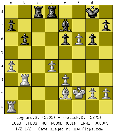 Last move : 1/2-1/2 2013 May 12 12:0:59 [Event "FICGS__CHESS__WCH_ROUND_ROBIN_FINAL__000009"] [Site "FICGS"] [Date "2013.03.24"] [Round "1"] [White "Legrand,Stephane"] [Black "Fraczek,Dariusz"] [Result "1/2-1/2"] [WhiteElo "2303"] [BlackElo "2273"] 1.d4 Nf6 2.c4 g6 3.Nc3 d5 4.cxd5 Nxd5 5.e4 Nxc3 6.bxc3 Bg7 7.Be3 c5 8.Qd2 cxd4 9.cxd4 Nc6 10.Rd1 O-O 11.Nf3 Bg4 12.Be2 Qa5 13.O-O Rac8 14.Qxa5 Nxa5 15.Rc1 Bxf3 16.Bxf3 Nc4 17.Be2 Nxe3 18.fxe3 Rfd8 19.e5 e6 20.Kf2 Bf8 21.a4 Ba3 22.Rb1 b6 23.Rb3 Be7 24.Ra1 f6 25.exf6 1/2-1/2 King's Indian defense, 3.Nc3 Kingside Castling by player Black (move 10) Kingside Castling by player White (move 13) This chess game ended in a draw. Follow this game move after move (download)The only thing Chess players have in common is Chess. (Lodewijk Prins) Es ist nicht das erste mal, dass sich die FIDE dem Arabischen Geld gebeugt hat (über die FIDE WM 2004 in Lybien). (Larry Evans) Las ideas audaces son como las piezas del Ajedrez que avanzan hacia adelante. Ellas pueden ser vencidas, pero también pueden iniciar una partida victoriosa. (Goethe) Les Echecs ne sont pas pour les âmes timides. Ils requièrent un homme entier, qui ne s'arrête pas aveuglément à ce qui a été déjà établi, mais qui tente individuellement de sonder les profondeurs du jeu. (W. Steinitz) Shallow men believe in luck. Strong men belive in cause and effect. (Ralph Waldo Emerson)