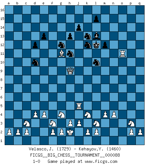 Last move : 1-0 2013 April 3 13:47:40 [Event "FICGS__BIG_CHESS__TOURNAMENT__000088"] [Site "FICGS"] [Date "2013.03.27"] [Round "1"] [White "Velasco,Jose Maria"] [Black "Kehayov,Yulian"] [Result "1-0"] [WhiteElo "1729"] [BlackElo "1460"] 1.j2-k4 p16-o14 2.h1-o7 j15-h13 3.o7-c7 h16-k14 4.c7-c15 b16-c14 5.c15-j9 k14-o10 6.h2-g4 o10-o2 7.n2-n3 o2-o10 8.e2-e4 e15-e13 9.d2-d4 d15-d13 10.f1-a6 h13-j15 11.o1-e10 h15-g13 12.m1-o1 m15-m13 13.o1-o10 n15-n13 14.j9-n13 o16-m14 15.n13-j9 j15-k13 16.m2-m4 k16-h15 17.c1-p13 m14-n15 18.n3-n4 q15-q14 19.p13-l9 f16-e15 20.l1-p5 g16-j15 21.p1-n2 l16-m15 22.q1-o1 m15-l14 23.b1-c3 e15-f14 24.o1-o7 m16-m14 25.o7-p7 q16-p16 26.o10-p10 m13-m12 27.p10-p15 p16-p15 28.p7-p15 m14-n14 29.n2-p3 o14-n12 30.p15-o15 n15-l13 31.o15-q15 h15-j13 32.l9-q14 j15-h13 33.q15-q16 n14-n16 34.q16-n16 j16-j15 35.n16-e16 g13-e14 36.p5-f14 h13-f14 37.e16-q16 a16-b16 38.j9-p9 c16-d15 39.q16-b16 c14-b16 40.p9-a9 b16-c14 41.q14-k8 e14-f12 42.e10-f11 d15-e14 43.k1-l3 d13-d12 44.j1-h2 a15-a14 45.g1-f3 k13-j11 46.e1-o1 j11-l10 47.k8-l7 l14-h11 48.o1-o12 n12-m14 49.o12-o16 h11-g12 50.f11-g12 e14-g12 51.a6-g12 f14-g12 52.a9-b9 m14-k13 53.b9-j16 j15-k14 54.o16-o14 j13-l14 55.a1-o1 k14-j13 56.j16-k15 l14-k12 57.k15-g15 l10-j11 58.l7-g11 j13-j12 59.g15-f15 h14-h13 60.f15-b15 c14-a13 61.b15-a14 a13-b11 62.a14-f9 f12-h11 63.o1-o5 b11-d10 64.f9-m9 j11-l10 65.o5-j5 j12-k11 66.o14-o11 k11-l12 67.m9-h9 1-0 Follow this game move after move (download)When you don't know what to play, wait for an idea to come into your opponent's mind. You may be sure that idea will be wrong. (Siegbert Tarrasch) Du kannst im Schach nur gut werden, wenn du das Spiel liebst. (Robert James Fischer) El ganar no lo es todo... pero el perder es nada. (Mednis) Il n'y a pas de prix trop élevé au scalp de l'ennemi. (Koblentz) Art disturbs, science reassures. (Georges Braque, Le Jour et la Nuit)