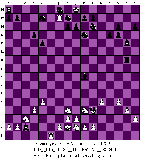 Last move : 1-0 2013 August 7 5:16:2 [Event "FICGS__BIG_CHESS__TOURNAMENT__000088"] [Site "FICGS"] [Date "2013.03.27"] [Round "1"] [White "Uzzaman,Ashik"] [Black "Velasco,Jose Maria"] [Result "1-0"] [WhiteElo ""] [BlackElo "1729"] 1.b1-c3 j15-k13 2.j2-k4 h16-o10 3.p1-o3 o10-f2 4.g1-f3 f2-o10 5.f3-h4 n15-n13 6.h1-n6 k16-l14 7.m2-m4 d15-d13 8.d2-d4 c16-n6 9.k1-l3 o16-d6 10.e2-e4 e15-e13 11.e4-e5 d6-e7 12.h2-f3 f16-a11 13.m4-m5 n6-l8 14.n2-n4 m15-m13 15.o1-g8 e7-h4 16.f3-h4 l16-p12 17.l3-j2 o15-o13 18.c1-p13 p16-o14 19.f1-c4 q15-q14 20.p13-o14 p15-o14 21.l1-n3 b16-c14 22.g8-m13 e13-e12 23.m13-k11 o10-n11 24.k11-f15 n11-f4 25.j1-h1 f4-f15 26.e1-f1 f15-p6 27.o3-p5 e16-f16 28.o2-o4 m16-m11 29.o4-o5 p6-n8 30.n3-o4 m11-f11 31.h1-h2 l8-k9 32.c4-b3 q16-m16 33.o4-c15 m16-m10 34.p2-p4 m10-p10 35.f1-f11 f16-f11 36.a1-f1 f11-f1 37.m1-f1 p10-p5 38.q2-q3 n8-n4 39.b3-l12 k9-c2 40.j2-l3 n4-l4 41.l3-j2 l4-l12 42.c15-o4 p5-p10 43.f1-f12 l12-l4 44.o4-k8 a11-d14 45.f12-f15 d14-k8 46.f15-g15 c14-e15 47.q1-f1 1-0 This big chess game has been lost on time (started : 2013.03.27 16:36:36) Follow this game move after move (download)There's never before been a Chess player with such a thorough knowledge of the intricacies of the game and such an absolutely indomitable will to win. I think Bobby is the greatest player that ever lived. (Lisa Lane) Das ganze Leben mit einer Ehefrau ist wie ein Endspiel mit ungleichfarbigen Läufern. (Viktor Kortschnoi) La belleza de un movimiento no se refleja solo en su apariencia, sino en el pensamiento detrás de él. (Siegbert Tarrasch) Il (Jacob Murray) ne joue pas pour le bon coup, mais pour le meilleur. (Eloi Relange) First of all, we have to go back to the classical time control. (Anatoly Karpov)