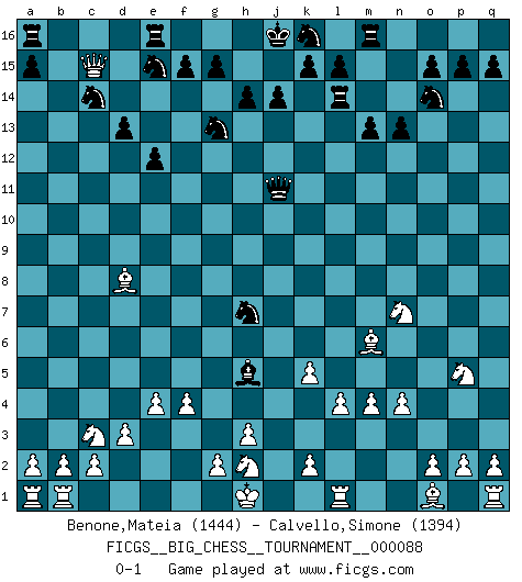 Last move : 0-1 2013 June 22 13:26:33 [Event "FICGS__BIG_CHESS__TOURNAMENT__000088"] [Site "FICGS"] [Date "2013.03.27"] [Round "1"] [White "Benone,Mateia"] [Black "Calvello,Simone"] [Result "0-1"] [WhiteElo "1444"] [BlackElo "1394"] 1.m2-m4 j15-k13 2.p1-o3 h15-g13 3.b1-c3 e15-e13 4.d2-d3 m15-m13 5.e2-e4 p16-o14 6.j2-k4 d15-d13 7.k1-l3 n15-n13 8.n2-n4 o16-m14 9.l1-o4 h16-o10 10.c1-k8 b16-c14 11.f2-f4 q16-n16 12.o4-l7 o10-b10 13.e1-b1 f16-b12 14.l3-m5 c16-n6 15.l2-l4 k13-l11 16.f1-e2 m14-f8 17.g1-j2 n16-n14 18.o3-p5 n6-p8 19.m5-n7 p8-n10 20.h1-d1 n10-e2 21.d1-e2 f8-k4 22.j2-k4 b12-k4 23.j3-k4 l11-j10 24.k8-g5 b10-c11 25.e2-g4 n14-k14 26.k4-k5 c11-j11 27.l7-m6 l16-p12 28.g4-b9 e13-e12 29.b9-b15 g16-e15 30.b15-c15 p12-h5 31.m1-l1 j10-k8 32.j1-h1 k8-h7 33.g5-d8 k14-l14 0-1 This big chess game has been lost on time (started : 2013.03.27 16:36:36) Follow this game move after move (download)Chess is life. (Bobby Fischer) Man gibt nur Pakete auf. (Paul Keres) Aquellos que dicen entender al Ajedrez, no entienden nada. (Robert Hubner) Si je n'étais pas joueur d'échecs, je serais le meilleur dans quelque chose d'autre. (Anatoli Karpov) Information on the Internet is subject to the same rules and regulations as conversation at a bar. (George Lundberg)