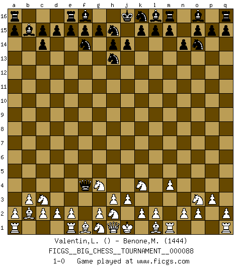 Last move : 1-0 2013 June 10 0:42:55 [Event "FICGS__BIG_CHESS__TOURNAMENT__000088"] [Site "FICGS"] [Date "2013.03.27"] [Round "1"] [White "Valentin,Laurentiu"] [Black "Benone,Mateia"] [Result "1-0"] [WhiteElo ""] [BlackElo "1444"] 1.j2-k4 p16-o14 2.p2-p3 b16-c14 3.o1-p2 j15-h13 4.p2-c14 b15-c14 5.b2-b3 c16-b15 6.m2-m4 n15-n14 7.c1-b2 h16-o10 8.p1-o3 o10-f2 9.b1-c3 g16-f14 10.h2-g4 f2-f4 11.k1-h2 1-0 This big chess game has been lost on time (started : 2013.03.27 16:36:36) Follow this game move after move (download)Suddenly it was obvious to me in my analysis I had missed what Fischer had found with the greatest of ease at the board. (Mikhail Botvinnik) Intelligenz läßt sich nicht am Weg, sondern nur am Ergebnis feststellen. (Garry Kasparov) Cada Peón es potencialmente una Reina. (James Mason) La tactique est l'élément le plus important du milieu de jeu. (Siegbert Tarrasch) Thus, what is of supreme importance in war is to attack the enemy's strategy. (Sun Tzu)