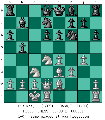 Last move : 1-0 2007 May 7 14:3:48 [Event "FICGS__CHESS__CLASS_E__000031"] [Site "FICGS"] [Date "2007.01.28"] [Round "1"] [White "Kis-Kos,Laszlo"] [Black "Baha,Ioana-Karina"] [Result "1-0"] [WhiteElo "1265"] [BlackElo "1400"] 1.e4 c5 2.Nf3 d6 3.d4 cxd4 4.Nxd4 Nf6 5.Nc3 e6 6.Be3 a6 7.Qd2 b5 8.f3 Nbd7 9.g4 h6 10.O-O-O Bb7 11.Be2 1-0 This chess game has been lost on time (started : 2007.01.28 15:4:48) Sicilian : Scheveningen, English variation Queenside Castling by player White (move 10) Player White won this chess game. Follow this game move after move (download)Examine moves that smite! A good eye for smites is far more important than a knowledge of strategical principles. (Purdy) Karpov ist ein Museumsstück. (Garry Kasparov) Las piezas de Ajedrez son los bloques del alfabeto que moldean los pensamientos; y esos pensamientos, aunque hagan un diseño visual en el tablero, expresan abstractamente su belleza como un poema. (Marcel Duchamp) La tactique, c'est ce que vous faites quand il y a quelque chose à faire; la stratégie, c'est ce que vous faites quand il n'y a rien à faire. (Savielli Tartacower) The smarter you play, the luckier you'll be. (Mark Pilarski)