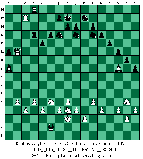 Last move : 0-1 2013 June 29 4:29:4 [Event "FICGS__BIG_CHESS__TOURNAMENT__000088"] [Site "FICGS"] [Date "2013.03.27"] [Round "1"] [White "Krakovsky,Peter"] [Black "Calvello,Simone"] [Result "0-1"] [WhiteElo "1237"] [BlackElo "1394"] 1.g2-g4 h15-g13 2.h1-d5 m15-m13 3.m2-m4 n15-n13 4.e2-e4 e15-e13 5.f1-b5 g16-f14 6.d2-d4 d15-d14 7.p2-p3 p16-o14 8.o1-p2 f16-e15 9.c1-p13 o16-n15 10.l1-p5 k16-h15 11.d5-n5 n13-n12 12.n5-l5 l15-l14 13.l2-l4 b16-c14 14.k1-l3 q16-n16 15.f2-f4 c16-e14 16.c2-c4 l16-n14 17.e1-e3 a15-a14 18.m1-m3 a16-d16 19.e3-b3 d14-d13 20.b5-a6 b15-b13 21.l3-m5 j15-k13 22.m3-k3 h16-o10 23.o2-o4 q15-q14 24.p13-k8 o10-c10 25.b1-d2 c10-a8 26.a6-b7 a8-d11 27.g1-f3 n14-q11 28.j2-k4 n15-f8 29.b7-c6 q11-o9 30.h3-h4 o9-l12 31.d4-d5 f8-b12 32.k4-h5 b12-c13 33.k8-j7 c13-j7 34.h5-j7 e15-c13 35.h4-h5 d11-n11 36.p5-l9 n11-p11 37.a1-f1 o14-p12 38.f3-h4 p12-n13 39.l5-k5 n13-m11 40.l9-k8 o15-o13 41.p2-q3 e14-q3 42.p1-q3 p11-p4 43.q3-p5 p4-n2 44.j1-j2 n2-n10 45.q1-n1 n10-q10 46.q2-q4 p15-p13 47.h4-g6 o13-o12 48.d2-f3 o12-o11 49.k8-g11 m16-m15 50.c6-a8 p13-p12 51.n1-n3 p12-p11 52.f1-n1 q14-q13 53.k5-h7 f14-h13 54.g11-n5 c13-d14 55.h7-c7 c14-d12 56.h2-j4 q10-a10 57.a8-h15 g13-h15 58.f3-e5 a10-a2 59.c7-b7 a2-a10 60.j2-h3 q13-q12 61.b3-a3 a10-c12 62.m5-k6 b13-b12 63.a3-a6 q12-q11 64.n5-q8 c15-c13 65.l4-l5 q11-q10 66.n1-a1 d16-a16 67.n3-n8 e16-e14 68.n8-j8 h13-f14 69.a6-a9 d14-c15 70.a9-j9 k13-j15 71.j4-h6 j15-g14 72.j9-a9 p11-p10 73.j8-c8 c12-b13 74.q8-m12 a14-a13 75.j7-g8 e14-a14 76.k3-k4 a13-a12 77.k4-j4 a12-a11 78.g6-e7 f14-d15 79.c8-f8 f15-f13 80.b7-b9 e13-e12 81.b9-g9 d12-f11 82.g9-k9 a14-f14 83.b2-b4 a16-f16 84.a1-n1 m15-n15 85.m12-o14 n15-n14 86.o14-q12 c15-e13 87.a9-d9 e13-c11 88.f8-f7 c11-h6 89.f7-k7 h6-n1 90.k9-k15 j16-h16 91.k15-m15 m11-n13 92.m15-l15 n1-f8 93.q12-o10 h16-g16 94.d9-k9 f8-m14 95.l15-d8 g14-j13 96.o10-n9 m14-l15 97.n9-m8 f14-g14 98.d8-d13 f16-f15 99.m8-h12 f11-h12 100.g8-f6 b13-c14 101.d13-d9 g14-d14 102.d9-g9 l15-m14 103.g9-h8 h12-k13 104.e5-g6 q10-q9 105.j4-k4 n13-m11 106.f6-g8 m14-n13 107.h8-h10 d15-f14 108.k6-l4 f14-g12 109.h10-h6 n16-k16 110.g8-h10 g12-h10 111.h6-h10 n14-n16 112.b4-b5 k16-k15 113.l4-j5 n16-k16 114.h10-e10 h15-g13 115.e10-e8 k13-m14 116.k9-k15 k16-k15 117.k7-k15 m14-k15 118.j5-l6 l12-k13 119.e8-j8 f15-d15 120.j8-j6 c14-a14 121.j6-j7 n13-o12 122.j7-f7 d14-d11 123.k4-j4 d11-f11 124.f7-c10 a14-d11 125.c10-c13 o12-f4 126.c13-b12 f4-g5 127.e7-f5 g5-b10 128.j4-j7 d11-k5 129.h3-g3 k5-l6 130.j7-c7 f11-d11 131.c7-c16 d15-d16 132.c16-c8 l6-l7 133.g6-h4 d11-d12 134.b12-b13 d12-d13 135.b13-b11 g16-h15 136.g3-h2 l7-a7 137.c8-c15 a7-f2 138.h2-h3 m11-l13 139.k2-k3 k13-o9 140.j3-j4 b10-a9 0-1 Follow this game move after move (download)In blitz, the Knight is stronger than the Bishop. (Vlastimil Hort) Ich glaube nicht an Psychologie, ich glaube an gute Züge. (Robert James Fischer) Con o sin el título, Bobby Fischer fue sin lugar a dudas el mas grande jugador de su época. (Burt Hochberg) Il s'avisa de me proposer d'apprendre les échecs qu'il jouait un peu... me voilà forcené des échecs. J'achète un échiquier, je m'enferme dans ma chambre, j'y passe des jours et des nuits à vouloir apprendre par cur toutes les parties. (Jean-Jacques Rousseau, Confessions) Knowledge will give you power, but character respect. (Bruce Lee)