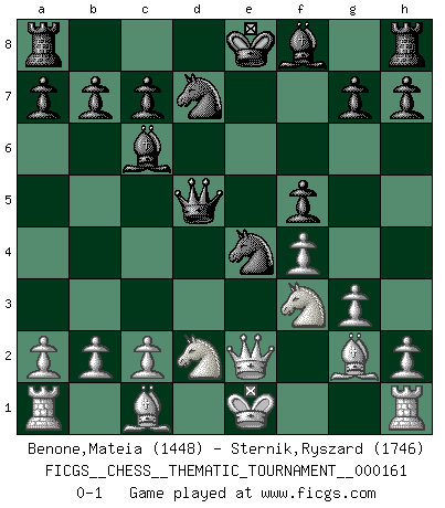 Last move : 0-1 2013 July 7 3:1:3 [Event "FICGS__CHESS__THEMATIC_TOURNAMENT__000161"] [Site "FICGS"] [Date "2013.03.28"] [Round "1"] [White "Benone,Mateia"] [Black "Sternik,Ryszard"] [Result "0-1"] [WhiteElo "1448"] [BlackElo "1746"] 1.e4 e5 2.f4 d5 3.exd5 e4 4.d3 Nf6 5.dxe4 Nxe4 6.Qe2 Qxd5 7.Nd2 f5 8.g3 Bd7 9.Bg2 Bc6 10.Ngf3 Nd7 0-1 This chess game has been lost on time (started : 2013.03.28 19:24:52) KGD : Falkbeer, Charousek gambit Player Black won this chess game. Follow this game move after move (download)The Pawns are the soul of the game. (Francois Andre Danican Philidor) Sicherlich können nur Meister einen Stil haben. Daß ein nicht-Meister auch nur ein einziges Mal in seinem Leben eine Partie folgerecht durchführte, habe ich niemals bemerkt. (Emanuel Lasker) Los problemas de Ajedrez exigen del compositor las mismas virtudes que caracterizan todo el arte de valor: originalidad, invención, concisión, armonía, complejidad e insinceridad explendida. (Vladimir Nabokov) Il (Jacob Murray) ne joue pas pour le bon coup, mais pour le meilleur. (Eloi Relange) He who is a good ruler must first have been ruled. (Aristotle)