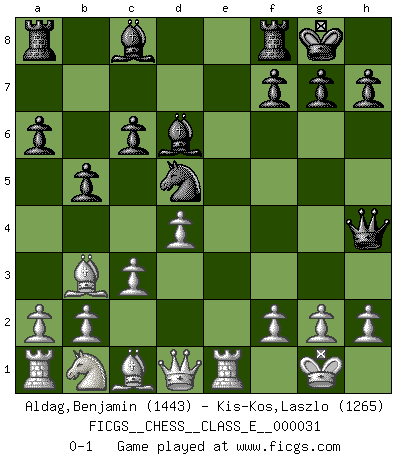 Last move : 0-1 2007 April 4 9:45:6 [Event "FICGS__CHESS__CLASS_E__000031"] [Site "FICGS"] [Date "2007.01.28"] [Round "1"] [White "Aldag,Benjamin"] [Black "Kis-Kos,Laszlo"] [Result "0-1"] [WhiteElo "1443"] [BlackElo "1265"] 1.e4 e5 2.Nf3 Nc6 3.Bb5 a6 4.Ba4 Nf6 5.O-O Be7 6.Re1 b5 7.Bb3 O-O 8.c3 d5 9.exd5 Nxd5 10.Nxe5 Nxe5 11.Rxe5 c6 12.d4 Bd6 13.Re1 Qh4 0-1 Ruy Lopez : Closed, 7...O-O Kingside Castling by player White (move 5) Kingside Castling by player Black (move 7) Player Black won this chess game. Follow this game move after move (download)Chess is thirty to forty percent psychology. You don't have this when you play a computer. I can't confuse it. (Judith Polgar) Du kannst im Schach nur gut werden, wenn du das Spiel liebst. (Robert James Fischer) El ganar no lo es todo... pero el perder es nada. (Mednis) Il n'y a pas de prix trop élevé au scalp de l'ennemi. (Koblentz) Art disturbs, science reassures. (Georges Braque, Le Jour et la Nuit)